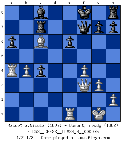 Last move : 1/2-1/2 2009 September 17 23:42:56 [Event "FICGS__CHESS__CLASS_B__000075"] [Site "FICGS"] [Date "2009.05.02"] [Round "1"] [White "Mascetra,Nicola"] [Black "Dumont,Freddy"] [Result "1/2-1/2"] [WhiteElo "1897"] [BlackElo "1882"] 1.d4 Nf6 2.c4 c6 3.Nc3 d5 4.Nf3 e6 5.e3 Nbd7 6.Bd3 dxc4 7.Bxc4 b5 8.Bd3 a6 9.e4 c5 10.d5 c4 11.Bc2 Qc7 12.O-O Bc5 13.dxe6 fxe6 14.e5 Nxe5 15.Bf4 Bd6 16.Nxe5 Bxe5 17.Bxe5 Qxe5 18.Re1 Qc5 19.Ne4 Nxe4 20.Bxe4 Ra7 21.b4 Qg5 22.f4 Qh4 23.g3 Qe7 24.Qh5+ Qf7 25.Bc6+ Kf8 26.Qf3 Rc7 27.a4 bxa4 28.Rxa4 1/2-1/2 Queen's pawn game Kingside Castling by player White (move 12) This chess game ended in a draw. Follow this game move after move (download)Chess is 99 percent tactics. (Teichmann) Mein erstes Ziel war nicht, die Partie zu gewinnen, sondern eine Figur zu opfern. -- der junge (Wilhelm Steinitz) No hay otro maestro que tenga una voluntad terrífica de ganar. Al tablero, el irradía peligro y aún los oponentes mas fuertes tienden a congelarse como liebres cuando olfatean a una pantera. Aún sus debilidades son peligrosas. Con las blancas, su juego de apertura es predecible - te es posible hacer planes en su contra - pero es tan fuerte que tus planes casi nunca funcionan. En el juego medio, su precisión e invención son fabulosas y en finales, tú simplemente no le puedes vencer. (Experto Alemán anónimo) Je menace de comprendre la position. (Anonyme) The ultimate in disposing one's troops is to be without ascertainable shape. Then the most penetrating spies cannot pry in nor can the wise lay plans against you. (Sun Tzu)