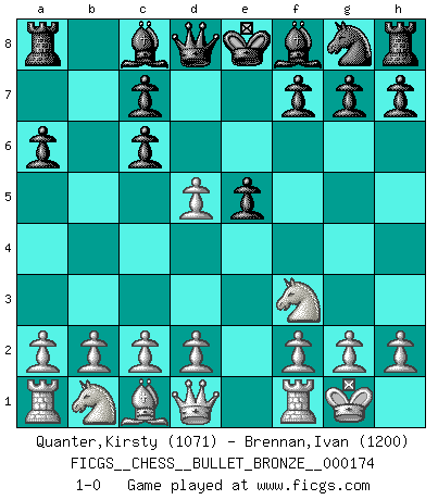Last move : 1-0 2010 March 23 20:11:41 [Event "FICGS__CHESS__BULLET_BRONZE__000174"] [Site "FICGS"] [Date "2010.03.23"] [Round "1"] [White "Quanter,Kirsty"] [Black "Brennan,Ivan"] [Result "1-0"] [WhiteElo "1071"] [BlackElo "1200"] 1.e4 e5 2.Nf3 Nc6 3.Bb5 a6 4.Bxc6 bxc6 5.O-O d5 6.exd5 1-0 This chess game has been lost on time (started : 2010.03.23 19:57:54) Ruy Lopez : Exchange variation Kingside Castling by player White (move 5) Player White won this chess game. Follow this game move after move (download)War is the child of passion, passion is the child of narcissism and narcissism is the child. (...) Another game ? (Thibault de Vassal) Ich habe die besten Aussichten, den ersten Preis zu gewinnen - denn jeder muss gegen Steinitz spielen, nur ich nicht! (Wilhelm Steinitz) En la perfecta combinación de Ajedrez como en una historia corta de primera clase, toda la trama y contra trama deberá conducir hacia un final sorprendente, el interes no es mitigado hasta el último momento. (Yates and Winter) Les échecs sont utiles à l'exercice de la faculté de penser et à celle de l'imagination. Car nous devons posséder une méthode élaborée pour atteindre des buts partout où nous devons conduire notre raison. (Leibnitz) Waiting for chance ? Play in casinos. (FICGS proverb)