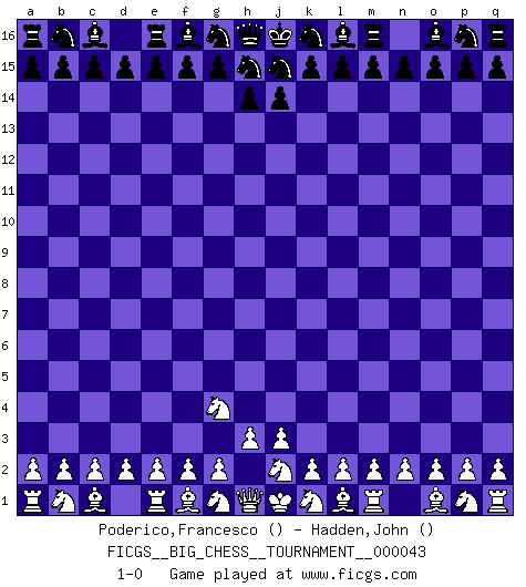 Last move : 1-0 2009 June 2 19:7:5 [Event "FICGS__BIG_CHESS__TOURNAMENT__000043"] [Site "FICGS"] [Date "2009.05.03"] [Round "1"] [White "Poderico,Francesco"] [Black "Hadden,John"] [Result "1-0"] [WhiteElo ""] [BlackElo ""] 1.h2-g4 1-0 This big chess game has been lost on time (started : 2009.05.03 3:30:21) Follow this game move after move (download)Don't even mention losing to me. I can't stand to think of it. (Bobby Fischer) Rauchen ist dem Schachspieler bei seiner Arbeit, also im Wettkampf, untersagt. (Viktor Kortschnoi) No todos los artistas son jugadores de Ajedrez, pero todos los jugadores de Ajedrez son artistas. (Marcel Duchamp) La tactique est l'élément le plus important du milieu de jeu. (Siegbert Tarrasch) To be champion requires more than simply being a strong player; one has to be a strong human being as well. (Anatoly Karpov)