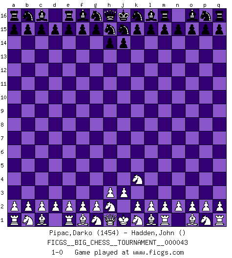 Last move : 1-0 2009 June 2 19:7:5 [Event "FICGS__BIG_CHESS__TOURNAMENT__000043"] [Site "FICGS"] [Date "2009.05.03"] [Round "1"] [White "Pipac,Darko"] [Black "Hadden,John"] [Result "1-0"] [WhiteElo "1454"] [BlackElo ""] 1.j2-k4 1-0 This big chess game has been lost on time (started : 2009.05.03 3:30:21) Follow this game move after move (download)I like to say that Bobby Fischer was the greatest player ever. But what made Fischer a genius was his ability to blend an American freshness and pragmatism with Russian ideas about strategy. (Bruce Pandolfini) Obwohl ich vom Stil her kaum zu den Priestern der Schachkunst gezählt werde, halte ich Schach doch für eine Kunst. (Tigran Petrosjan) Botvinnik trataba de restarle el misterio al Ajedrez, siempre relacionandolo a situaciones de la vida ordinaria. El gustaba de llamar al Ajedrez un típico problema inexacto similar a aquellos de los cuales la gente siempre tiene que enfrentarse en la vida cotidiana. (Garry Kasparov) Des idées, des idées, j'en ai cent, j'en ai mille. Des bonnes, des mauvaises, applicables, irréalisables... Il suffit de faire le tri ! (Roos) If you know the enemy and know yourself you need not fear the results of a hundred battles. (Sun Tzu)