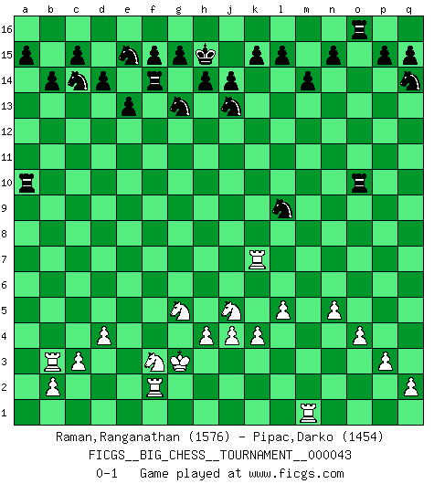 Last move : 0-1 2009 October 14 9:4:39 [Event "FICGS__BIG_CHESS__TOURNAMENT__000043"] [Site "FICGS"] [Date "2009.05.03"] [Round "1"] [White "Raman,Ranganathan"] [Black "Pipac,Darko"] [Result "0-1"] [WhiteElo "1576"] [BlackElo "1454"] 1.j2-k4 j15-k13 2.h1-o7 h15-g13 3.o7-o15 e15-e14 4.n2-n4 h16-n11 5.o2-o3 m15-m14 6.d2-d4 l16-n14 7.o15-o16 n11-c1 8.e1-c1 m16-o16 9.m2-m4 f16-c13 10.l1-o4 c13-m4 11.l2-l3 m4-h8 12.e2-e3 o16-o4 13.k4-m5 o4-o10 14.c2-c3 o10-m10 15.p1-n2 e14-e13 16.n2-l1 h8-k6 17.l1-k3 k6-f2 18.g1-f3 f2-e3 19.c1-e1 e3-f2 20.e1-e2 f2-g3 21.h3-h4 d15-d14 22.o1-l4 n14-c4 23.e2-e7 c4-f1 24.b1-d2 f1-g2 25.a1-g1 g3-h2 26.k3-h2 g2-h3 27.k1-m2 b15-b14 28.f3-g5 h3-o9 29.m5-n7 o9-l12 30.d2-f3 l12-a2 31.g1-a1 a2-b3 32.n7-l8 m10-m8 33.l8-k10 c16-a14 34.a1-a3 a14-l4 35.a3-b3 l4-n2 36.m1-n1 m8-m2 37.h2-k3 m2-m10 38.n1-n2 m10-k10 39.k3-j5 e16-e14 40.q1-m1 b16-c14 41.k2-k4 e14-f14 42.e7-c7 g16-e15 43.n2-f2 k10-a10 44.j1-h2 p16-q14 45.p2-p3 q16-o16 46.o3-o4 o16-o10 47.n4-n5 k16-l14 48.h2-g3 j16-h15 49.c7-h7 a16-o16 50.l3-l4 k13-m12 51.l4-l5 m12-n10 52.h7-k7 l14-j13 53.j3-j4 n10-l9 0-1 This big chess game has been lost on time (started : 2009.05.03 3:30:21) Follow this game move after move (download)It is difficult to play against Einstein's theory --on his first loss to Fischer. (Mikhail Tal) Es ist nicht das erste mal, dass sich die FIDE dem Arabischen Geld gebeugt hat (über die FIDE WM 2004 in Lybien). (Larry Evans) No existe un remordimiento como el remordimiento del Ajedrez. (H. G. Wells) Les sacrifices démontrent seulement que quelqu'un a gaffé. (Savielly Tartacover) You can't play chess if you're groggy from pills. (Anatoly Karpov)