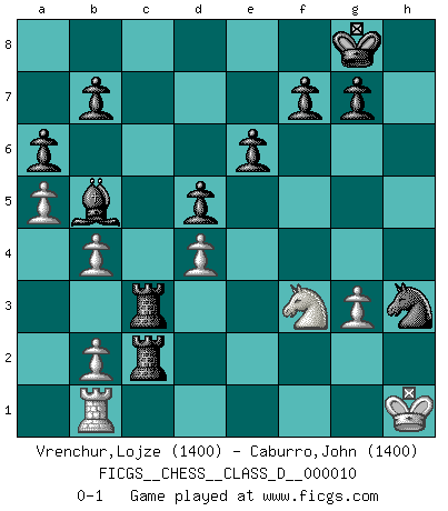 Last move : 0-1 2006 October 8 21:2:50 [Event "FICGS__CHESS__CLASS_D__000010"] [Site "FICGS"] [Date "2006.09.11"] [Round "1"] [White "Vrenchur,Lojze"] [Black "Caburro,John"] [Result "0-1"] [WhiteElo "1400"] [BlackElo "1400"] 1.e4 c6 2.d4 d5 3.Nc3 dxe4 4.Nxe4 Nd7 5.Qf3 Ngf6 6.Bg5 Nxe4 7.Qxe4 Qa5+ 8.c3 Qxg5 9.Nf3 Qd5 10.Qxd5 cxd5 11.Bb5 a6 12.Bd3 Nf6 13.O-O e6 14.Rfe1 Bd6 15.h3 O-O 16.a4 Bd7 17.a5 Bb5 18.Bc2 Rac8 19.g3 Bb4 20.Bxh7+ Kxh7 21.cxb4 Rc2 22.Rab1 Rfc8 23.Ng5+ Kg8 24.Nf3 Ne4 25.Re3 Nxf2 26.Rc3 Nxh3+ 27.Kh1 R8xc3 0-1 Caro-Kann : Steinitz variation Kingside Castling by player White (move 13) Kingside Castling by player Black (move 15) Player Black won this chess game. Follow this game move after move (download)It's always better to sacrifice your opponent's men. (Savielly Tartakover) Später, ... hatte ich zunehmend Erfolg in entscheidenden Partien. Vielleicht weil ich eine einfache Wahrheit erkannte: nicht nur ich hatte Angst, auch mein Gegner. (Mikhail Nekhemyevich Tal) Sin errores no puede haber brillantez. (Emanuel Lasker) Des combinaisons [dans le jeu d'échecs] pareilles à des mélodies. Je crois entendre pour ainsi dire la musique des coups... (Vladimir Nabokov) Always be a first-rate version of yourself, instead of a second-rate version of somebody else. (Judy Garland)