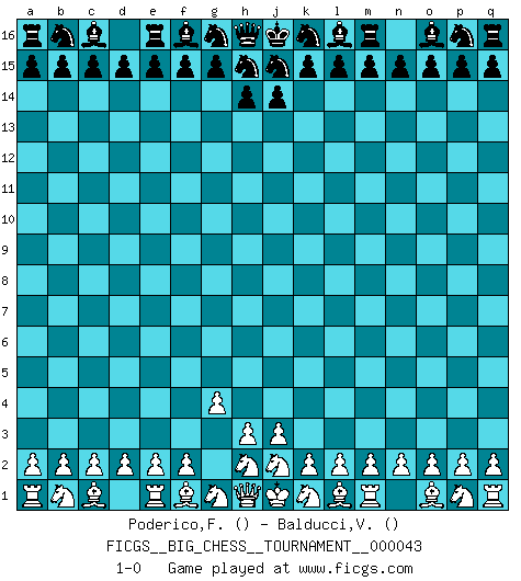 Last move : 1-0 2009 June 2 19:7:5 [Event "FICGS__BIG_CHESS__TOURNAMENT__000043"] [Site "FICGS"] [Date "2009.05.03"] [Round "1"] [White "Poderico,Francesco"] [Black "Balducci,Vincent"] [Result "1-0"] [WhiteElo ""] [BlackElo ""] 1.g2-g4 1-0 This big chess game has been lost on time (started : 2009.05.03 3:30:21) Follow this game move after move (download)Later, I began to succeed in decisive games. Perhaps because I realized a very simple truth: not only was I worried, but also my opponent. (Mikhail Tal) Die Arbeit ist etwas Unnatürliches. Die Faulheit allein ist göttlich. (Anatole France) El Ajedrez tiene tanto misterio como las mujeres. (Purdy) La victoire dans une partie d'Echecs appartient la plupart du temps à celui qui voit un peu plus loin que l'adversaire. (Lasker) Wipe them out. All of them. (Darth Sidious in Star Wars ep.1)