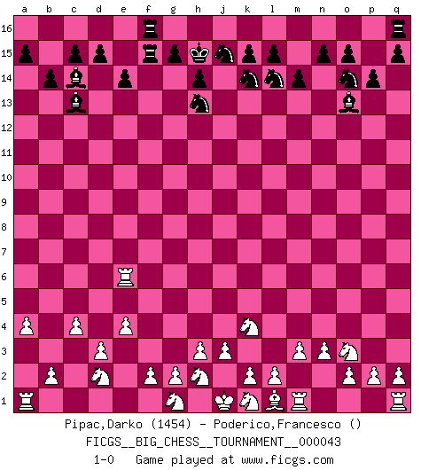Last move : 1-0 2009 June 3 21:31:59 [Event "FICGS__BIG_CHESS__TOURNAMENT__000043"] [Site "FICGS"] [Date "2009.05.03"] [Round "1"] [White "Pipac,Darko"] [Black "Poderico,Francesco"] [Result "1-0"] [WhiteElo "1454"] [BlackElo ""] 1.j2-k4 m15-m14 2.e2-e4 l16-o13 3.h1-o7 p15-p14 4.o7-f15 g16-f14 5.f1-a6 k16-l14 6.d2-d3 o16-p15 7.c2-c3 h16-g16 8.f15-j12 e15-e14 9.a6-j14 h15-k14 10.j12-e16 f14-e16 11.j14-g16 j15-g16 12.e1-e3 f16-c13 13.n2-n3 b15-b14 14.e3-f3 e16-f14 15.c1-g5 c16-b15 16.p1-o3 b16-c14 17.o1-l4 g16-j15 18.g5-f6 p15-f6 19.f3-f6 p16-o14 20.f6-e6 j16-h15 21.l4-b13 a16-f16 22.b1-d2 f16-f15 23.b13-c14 b15-c14 24.m2-m3 m16-f16 25.a2-a4 f14-h13 26.c3-c4 1-0 Follow this game move after move (download)No price is too great for the scalp of the enemy King. (Koblentz) Der Partner hat auch seine Existenzberechtigung. (Savielly Grigorievitsch Tartakower) Los finales de Peón son del Ajedrez lo que el cesped es del Golf. (Cecil Purdy) La vérité est comme le meilleur coup aux échecs : elle existe, mais il faut la chercher. (Arturo Perez-Reverte) Excelling at chess has long been considered a symbol of more general intelligence. That is an incorrect assumption in my view, as pleasant as it might be. But for the purposes of argument and investigation, chess is, in Russkin-Gutman's words, 'an unparalleled laboratory, since both the learning process and the degree of ability obtained can be objectified and quantified, providing an excellent comparative framework on which to use rigorous analytical techniques.' (The Chess Master and the Computer, by Garry Kasparov - 2010)