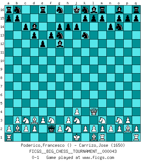 Last move : 0-1 2009 May 23 14:11:20 [Event "FICGS__BIG_CHESS__TOURNAMENT__000043"] [Site "FICGS"] [Date "2009.05.03"] [Round "1"] [White "Poderico,Francesco"] [Black "Carrizo,Jose"] [Result "0-1"] [WhiteElo ""] [BlackElo "1650"] 1.j3-j4 j15-k13 2.j2-k4 h16-o10 3.k4-m3 o10-f2 4.g1-f3 p16-o14 5.b2-b3 f2-o10 6.p1-o3 h15-g13 7.c1-b2 c15-c14 8.e2-e3 d15-d13 9.f1-d3 n15-n14 10.k1-j3 e15-e13 11.b1-c3 f16-d14 12.e1-f1 e13-e12 13.p2-p3 c16-g12 14.o1-p2 f15-f13 15.h1-l4 g15-g14 16.f1-f2 o10-f2 0-1 Follow this game move after move (download)All I want to do, ever, is just play Chess. (Bobby Fischer) Als er Schachweltmeister wurde ließ er praktisch alle stärksten Sovietspieler für sich arbeiten. Wenn ein auch nur mittelmässiger Meister ein Spezialist für eine bestimmte Eröffnung war, wurde er von Karpov gerufen. Das wurde alles geheim gehalten. (Mikhail Moiseyevich Botvinik) Solo el jugador con la iniciativa tiene el derecho a atacar. (Wilhelm Steinitz) J'ai vu le vaincu d'Echecs jouer des années durant dans l'espoir de la fête de la victoire. Car tu es plus riche de ce qu'elle existe si même elle n'est point pour toi. Ainsi de la perle du fond des mers. (Antoine de Saint-Exupéry) Mac users swear by their computers. PC users swear at their computers. (Author unknown)