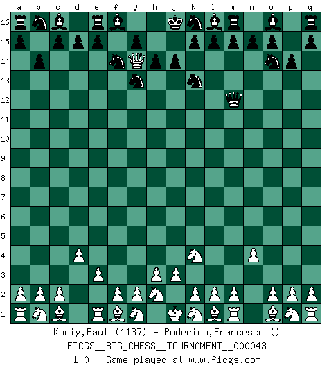 Last move : 1-0 2009 June 3 21:33:49 [Event "FICGS__BIG_CHESS__TOURNAMENT__000043"] [Site "FICGS"] [Date "2009.05.03"] [Round "1"] [White "Konig,Paul"] [Black "Poderico,Francesco"] [Result "1-0"] [WhiteElo "1137"] [BlackElo ""] 1.j2-k4 j15-k13 2.h1-o7 p16-o14 3.o7-f15 g16-f14 4.d2-d4 h15-g13 5.f15-l10 h16-m12 6.e2-e3 b15-b14 7.n2-n4 p15-p14 8.l10-g14 1-0 Follow this game move after move (download)The passed Pawn is a criminal, who should be kept under lock and key. Mild measures, such as police surveillance, are not sufficient. (Aaron Nimzovich) Die Idee von Capablanca, Schach als Fach in den Schulen zu lehren, ist großartig. (Fidel Castro) Haz el enroque temprano y seguido. (Rob Sillars) A ce moment-là, je menaçais de comprendre la position ! (Clément L'Heureux) Programming can only do so much before it becomes too much. (Don Groves)