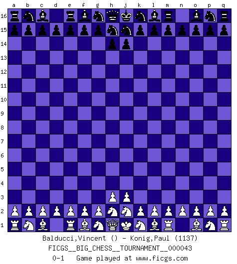 Last move : 0-1 2009 June 2 7:0:42 [Event "FICGS__BIG_CHESS__TOURNAMENT__000043"] [Site "FICGS"] [Date "2009.05.03"] [Round "1"] [White "Balducci,Vincent"] [Black "Konig,Paul"] [Result "0-1"] [WhiteElo ""] [BlackElo "1137"] 0-1 This big chess game has been lost on time (started : 2009.05.03 3:30:21) Follow this game move after move (download)Chess is a terrible game. If you have no center, your opponent has a freer position. If you do have a center, then you really have something to worry about ! (Siegbert Tarrasch) Im Wettkampf zwischen starken Meistern kommen Fehler sehr selten vor, deshalb ist es mit bloßem Warten nicht getan. (José Raúl Capablanca) En el Ajedrez, tal como es jugado por los Maestros, practicamente la suerte es eliminada. (Emanuel Lasker) Les écrivains ont utilisé les échecs pour analyser les côtés extrêmes de la nature humaine. Dans ce cadre, les échecs offrent un champ d'expérimentation idéal. Mais on pourrait faire la même chose avec la peinture. Et là, en vous référant à Van Gogh, vous ne tirerez pas de conclusion définitive sur les peintres. (Gary Kasparov) Every now and then a man's mind is stretched by a new idea and never shrinks back to its former dimensions. (Oliver Wendell Holmes, Sr.)