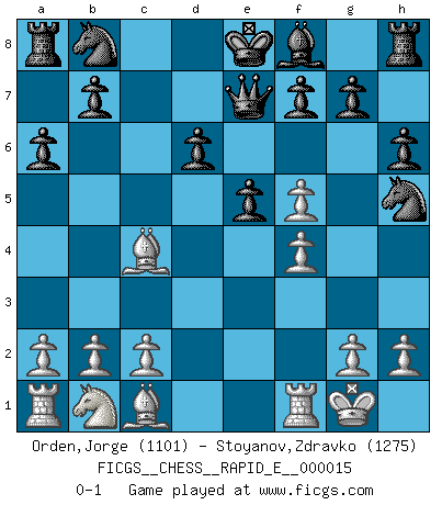 Last move : 0-1 2009 May 6 19:27:7 [Event "FICGS__CHESS__RAPID_E__000015"] [Site "FICGS"] [Date "2009.05.03"] [Round "1"] [White "Orden,Jorge"] [Black "Stoyanov,Zdravko"] [Result "0-1"] [WhiteElo "1101"] [BlackElo "1275"] 1.e4 c5 2.Nf3 a6 3.d4 cxd4 4.Nxd4 e5 5.Nf5 d6 6.Bc4 Bxf5 7.exf5 h6 8.Qh5 Qe7 9.O-O Nf6 10.f4 Nxh5 0-1 Sicilian : O'Kelly variation Kingside Castling by player White (move 9) Player Black won this chess game. Follow this game move after move (download)Suddenly it was obvious to me in my analysis I had missed what Fischer had found with the greatest of ease at the board. (Mikhail Botvinnik) Der zweitbeste Zug ist oft der einzig richtige. (Savielly Grigorievitsch Tartakower) La estratégia requiere pensar, la táctica requiere observación. (Max Euwe) Seul un grand joueur sait à quel point il joue faiblement. (Xavier Tartacover) Man is reluctant to give credit for intelligence to anyone, except his enemies. (Albert Einstein)
