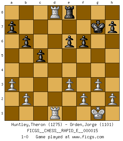 Last move : 1-0 2009 May 20 0:7:59 [Event "FICGS__CHESS__RAPID_E__000015"] [Site "FICGS"] [Date "2009.05.03"] [Round "1"] [White "Huntley,Theron"] [Black "Orden,Jorge"] [Result "1-0"] [WhiteElo "1275"] [BlackElo "1101"] 1.c4 c5 2.Nf3 Nf6 3.Nc3 e6 4.g3 Be7 5.Bg2 O-O 6.O-O Nc6 7.d4 b6 8.d5 exd5 9.cxd5 Nb4 10.a3 Na6 11.Nb5 Bb7 12.d6 Bxd6 13.Nxd6 Qc7 14.Nxb7 Qxb7 15.Ne5 d5 16.Bg5 Nc7 17.Bxf6 gxf6 18.Nd7 Rad8 19.Nxf8 Rxf8 20.e3 Kg7 21.Qg4+ Kh8 22.Qf5 Qc6 23.Rfd1 Rg8 24.Bxd5 Nxd5 25.Qxd5 Qe6 26.Qxe6 fxe6 27.Rd6 Re8 28.Rad1 Kg7 29.Rd8 1-0 English : Symmetrical variation Kingside Castling by player Black (move 5) Kingside Castling by player White (move 6) Player White won this chess game. Follow this game move after move (download)Place the contents of the Chess box in a hat, shake them up vigorously, pour them on the board from a height of two feet, and you get the style of Steinitz. (H. E. Bird) Es genügt nicht ein guter Spieler zu sein, man muß auch gut spielen. (Siegbert Tarrasch) Un buen sacrificio es aquel que aunque no sea necesariamente sólido, deja a tu oponente aturdido y confuso. (Rudolph Spielmann) Les échecs, c'est l'imagination. (David Bronstein) See no evil, hear no evil, speak no evil. (The 3 monkeys)