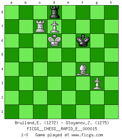 Last move : 1-0 2009 May 15 16:6:23 [Event "FICGS__CHESS__RAPID_E__000015"] [Site "FICGS"] [Date "2009.05.03"] [Round "1"] [White "Brulland,Emmanuel"] [Black "Stoyanov,Zdravko"] [Result "1-0"] [WhiteElo "1272"] [BlackElo "1275"] 1.c4 c5 2.Nc3 Nc6 3.g3 b6 4.Bg2 Bb7 5.d3 Na5 6.Nf3 Bc6 7.O-O e6 8.e4 d5 9.cxd5 exd5 10.exd5 Bd7 11.Re1+ Be7 12.d6 Nc6 13.dxe7 Ngxe7 14.Nd5 Be6 15.Nxe7 Nxe7 16.Ng5 Rc8 17.Nxe6 fxe6 18.Rxe6 O-O 19.Qb3 Kh8 20.Bg5 Rc7 21.Rae1 Qd4 22.Qc2 Nd5 23.Bxd5 Qxd5 24.Re8 Rcf7 25.Rxf8+ Rxf8 26.Be3 Qxa2 27.Qb1 Qb3 28.Rd1 Rd8 29.Kf1 c4 30.d4 g6 31.Ke2 Kg7 32.Rc1 b5 33.Rc3 Qb4 34.Qc2 Qe7 35.Qd1 Qe6 36.b3 a6 37.bxc4 bxc4 38.h4 a5 39.Kd2 Rd5 40.Rxc4 Qb6 41.Qc2 Rd7 42.Qa4 Qb2+ 43.Rc2 Qb4+ 44.Qxb4 axb4 45.Rb2 Rb7 46.Kd3 Kf6 47.Kc4 Ke6 48.Rxb4 Rc7+ 49.Kd3 Kf5 50.Rb5+ Kg4 51.d5 Rd7 52.Kd4 Kf3 53.Rc5 h6 54.Rc6 g5 55.hxg5 hxg5 56.Bxg5 Kxf2 57.Bf4 Kf3 58.Rc7 Rd8 59.d6 Kg4 60.d7 Kf5 61.Kd5 Kf6 62.Kd6 1-0 English : Symmetrical variation Kingside Castling by player White (move 7) Kingside Castling by player Black (move 18) 10 pieces endgame at move 55 : White KRBPPPP , Black KRP WHITE : King + 1 Rook 1 Bishop 4 Pawns BLACK : King + 1 Rook 1 Pawn 9 pieces endgame at move 55 : White KRBPPP , Black KRP WHITE : King + 1 Rook 1 Bishop 3 Pawns BLACK : King + 1 Rook 1 Pawn 8 pieces endgame at move 56 : White KRBPPP , Black KR WHITE : King + 1 Rook 1 Bishop 3 Pawns BLACK : King + 1 Rook 7 pieces endgame at move 56 : White KRBPP , Black KR WHITE : King + 1 Rook 1 Bishop 2 Pawns BLACK : King + 1 Rook Player White won this chess game. Follow this game move after move (download)Chess is like war on a board. (Bobby Fischer) Ich weiss nicht was Gott gegen mich auf 1.e4 antworten würde. (Robert James Fischer) Jugadores de primera clase pierden en contra de jugadores de segunda clase porque los jugadores de segunda clase a veces juegan una partida de primer clase. (Siegbert Tarrasch) Mais l'homme est une créature légère et illogique : semblable au joueur d'échecs, il n'aime que le processus du but à atteindre, non le but lui-même. (Dostoïevsky) A generalist learns less and less about more and more until he knows nothing about everything. (Author unknown)