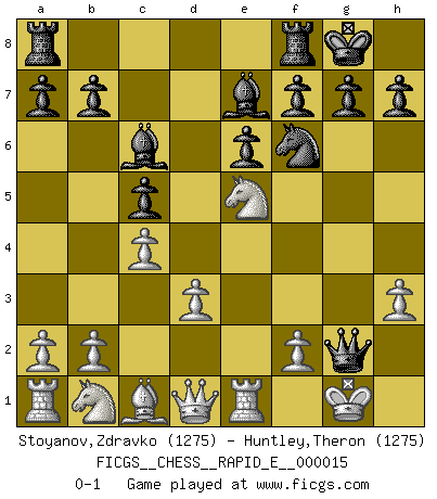 Last move : 0-1 2009 May 7 11:35:35 [Event "FICGS__CHESS__RAPID_E__000015"] [Site "FICGS"] [Date "2009.05.03"] [Round "1"] [White "Stoyanov,Zdravko"] [Black "Huntley,Theron"] [Result "0-1"] [WhiteElo "1275"] [BlackElo "1275"] 1.e4 c5 2.Nf3 d6 3.h3 Nf6 4.c3 Nc6 5.Bb5 Bd7 6.d3 e6 7.O-O Be7 8.Re1 O-O 9.Bxc6 Bxc6 10.e5 dxe5 11.Nxe5 Qd5 12.c4 Qxg2+ 0-1 Sicilian Kingside Castling by player White (move 7) Kingside Castling by player Black (move 8) Player Black won this chess game. Follow this game move after move (download)When you don't know what to do, wait for your opponent to get an idea - it's sure to be wrong. (Tarrasch) Wenn ich mich einlogge, glauben die Leute gewöhnlich nicht, dass ich es selbst bin und sie fangen an, mir dumme Fragen zu stellen. Und wenn sie es glauben, stellen sie wieder andere dumme Fragen. (Judith Polgar) Si el ingenio solamente fuese necesario para lucirse, las mujeres serían las mejores jugadoras de Ajedrez del mundo. (Albin) Karpov est une pièce de musée. (Garry Kasparov) Luck is when opportunity knocks and you answer. (Anonymous)