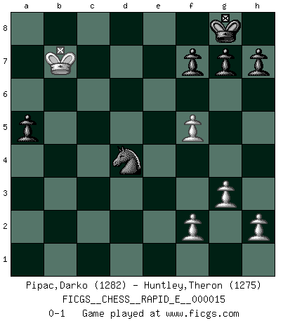 Last move : 0-1 2009 June 7 13:46:50 [Event "FICGS__CHESS__RAPID_E__000015"] [Site "FICGS"] [Date "2009.05.03"] [Round "1"] [White "Pipac,Darko"] [Black "Huntley,Theron"] [Result "0-1"] [WhiteElo "1282"] [BlackElo "1275"] 1.e4 c5 2.Nf3 d6 3.d4 cxd4 4.Nxd4 Nf6 5.Nc3 a6 6.Bf4 e5 7.Bxe5 dxe5 8.Nf5 Qxd1+ 9.Rxd1 Bxf5 10.exf5 Bb4 11.Rd3 Ne4 12.a3 Bxc3+ 13.bxc3 Nc5 14.Rd5 Nbd7 15.Bc4 Rc8 16.O-O O-O 17.Bb3 Nf6 18.Rxe5 Nxb3 19.cxb3 Rxc3 20.Rb1 Rfc8 21.g3 Rc1+ 22.Rxc1 Rxc1+ 23.Kg2 Rc3 24.b4 Rxa3 25.Ra5 Rxa5 26.bxa5 Nd5 27.Kf3 Nb4 28.Ke4 Nc6 29.Kd5 Nxa5 30.Kc5 Nc6 31.Kb6 a5 32.Kxb7 Nd4 0-1 Sicilian : Najdorf Kingside Castling by player White (move 16) Kingside Castling by player Black (move 16) Player Black won this chess game. Follow this game move after move (download)It is peculiar but a fact nevertheless, that gamblers in chess always have enthusiastic followers. (Botvinnik) Die FIDE ist dabei in die Hände der russischen Mafia zu fallen. (Larry Evans) Por esta medida (el intervalo entre Fischer y sus contemporaneos), yo le considero el mas grande campeón mundial. (Garry Kasparov) Les ravages du H expliquent la différence de niveau entre Tal et Thal [Abergel]. Good decisions come from experience, and experience comes from bad decisions. (Anonymous)