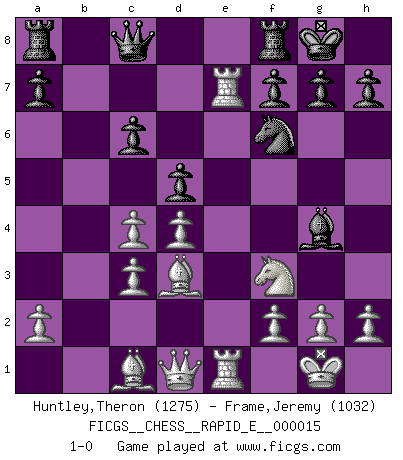 Last move : 1-0 2009 May 6 14:41:39 [Event "FICGS__CHESS__RAPID_E__000015"] [Site "FICGS"] [Date "2009.05.03"] [Round "1"] [White "Huntley,Theron"] [Black "Frame,Jeremy"] [Result "1-0"] [WhiteElo "1275"] [BlackElo "1032"] 1.e4 e5 2.Nf3 Nf6 3.Nxe5 d6 4.Nf3 Nxe4 5.d4 d5 6.Bd3 Be7 7.O-O O-O 8.c4 c6 9.Nc3 Nxc3 10.bxc3 Bg4 11.Re1 Nd7 12.Rb1 Nf6 13.Rxb7 Qc8 14.Rbxe7 1-0 Petrov : Classical attack, Mason variation Kingside Castling by player White (move 7) Kingside Castling by player Black (move 7) Player White won this chess game. Follow this game move after move (download)I am the best player in the world and I am here to prove it. (Bobby Fischer) Die Neutralität betrachte ich als eine schwere Krankheit. (Viktor Kortschnoi) El arma más poderosa en el Ajedrez, es tener la próxima movida. (David Bronstein) Assurément je connaissais par expérience le mystérieux attrait de ce jeu royal, le seul entre tous les jeux inventés par les hommes qui échappe souverainement à la tyrannie du hasard, le seul où l'on ne doive sa victoire qu'à son intelligence ou plutôt à une certaine forme d'intelligence. Mais n'est-ce pas déjà le limiter injurieusement que d'appeler les échecs un jeu ? N'est-ce pas une science, un art ou quelque chose qui, comme le cercueil de Mahomet entre ciel et terre, est suspendu entre l'un et l'autre, et qui réunit un nombre incroyable de contraires ? [...] C'est une pensée qui ne mène à rien, une mathématique qui n'établit rien, un art qui ne laisse pas d'uvre, une architecture sans matière; et il l'a prouvé néanmoins qu'il était plus durable, à sa manière, que les livres ou que tout autre monument, ce jeu unique qui appartient à tous les peuples et à tous les temps, et dont personne ne sait quel dieu en fit don à la terre pour tuer l'ennui, pour aiguiser l'esprit et stimuler l'âme. Où commence-t-il, où finit-il ? (Stefan Zweig) In my experience, there's no such thing as luck. (Obi-Wan Kenobi in Star Wars ep.4)