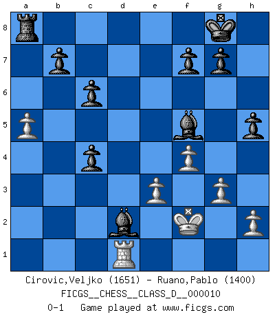 Last move : 0-1 2007 April 4 15:45:39 [Event "FICGS__CHESS__CLASS_D__000010"] [Site "FICGS"] [Date "2006.09.11"] [Round "1"] [White "Cirovic,Veljko"] [Black "Ruano,Pablo"] [Result "0-1"] [WhiteElo "1651"] [BlackElo "1400"] 1.d4 d5 2.e3 Nf6 3.c4 c6 4.Nc3 e6 5.Nf3 Nbd7 6.Bd3 Bd6 7.O-O O-O 8.c5 Bc7 9.Re1 e5 10.dxe5 Nxe5 11.Nxe5 Bxe5 12.Qc2 Qa5 13.f4 Bb8 14.Bd2 Qxc5 15.Na4 Qxc2 16.Bxc2 Re8 17.a3 Bd6 18.b4 Ne4 19.Bxe4 Rxe4 20.Nc3 Rc4 21.g3 Bf5 22.Kf2 h5 23.Rac1 a5 24.bxa5 Bxa3 25.Ra1 Bb2 26.Ra4 Bxc3 27.Rxc4 Bxd2 28.Rd1 dxc4 0-1 This chess game has been lost on time (started : 2006.09.11 9:57:48) Queen's pawn game Kingside Castling by player White (move 7) Kingside Castling by player Black (move 7) Player Black won this chess game. Follow this game move after move (download)Chess is imagination. (David Bronstein) Ich rechne überhaupt nicht voraus. Ich gewinne auch so. (Robert James Fischer) Te sientas frente a un tablero y repentinamente tu corazón brinca. Tu mano tiembla al tomar una pieza y moverla. Pero lo que el Ajedrez te enseña es que tu debes permanecer ahí con calma y pensar de que si realmente es una buena idea o de que si hay otras ideas mejores. (Stanley Kubrick) L'action d'une oeuvre littéraire se déroule sur un champ de bataille. Les masques et les types du drame moderne correspondent aux pièces du jeu d'échecs. L'intrigue correspond aux coups et aux gambits, c'est à dire aux techniques du jeu telles qu'utilisées et interprétées par les joueurs. Les tactiques et les péripéties [mouvements] correspondent aux coups exécutés par l'adversaire. (Viktor Shklovsky) The hypothalamus is one of the most important parts of the brain, involved in many kinds of motivation, among other functions. The hypothalamus controls the 'Four Fs: Fighting, Fleeing, Feeding and Mating. (Unknown author)