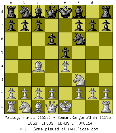 Last move : 0-1 2009 June 14 8:2:7 [Event "FICGS__CHESS__CLASS_C__000114"] [Site "FICGS"] [Date "2009.05.03"] [Round "1"] [White "Mackoy,Travis"] [Black "Raman,Ranganathan"] [Result "0-1"] [WhiteElo "1638"] [BlackElo "1396"] 1.e4 e5 2.Nf3 d6 3.Bc4 Nf6 0-1 This chess game has been lost on time (started : 2009.05.03 20:58:46) Philidor's defense Player Black won this chess game. Follow this game move after move (download)As one by one I mowed them down, my superiority soon became apparent. (Jose Capablanca) Frage des Reporters: -Welche besonderen Umstände rechtfertigen das Anhalten der Uhren während einer Turnierpartie? Antwort: -Einen Fotographen zu strangulieren. (Siegbert Tarrasch) Después de la respuesta de las negras a 1.e4 con 1..e5, se quedan siempre tratando de entrar dentro del juego. (Howard Staunton) Vous savez, camarade Pachman, je n'éprouve pas de plaisir à être ministre, je jouerais plutôt aux échecs comme vous, ou alors ferais une révolution au Venezuela. (Che Guevara à Ludek Pachman, 'Checkmate in Prague', 1975) I'm extremely disappointed. I send you out for exciting, new designer drugs, you come back with tomato sauce. (Gregory House, House M.D.)