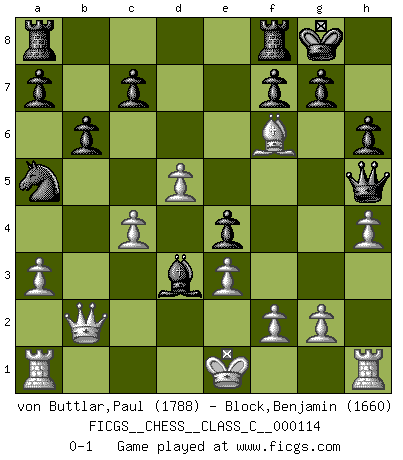Last move : 0-1 2009 June 27 11:2:22 [Event "FICGS__CHESS__CLASS_C__000114"] [Site "FICGS"] [Date "2009.05.03"] [Round "1"] [White "von Buttlar,Paul"] [Black "Block,Benjamin"] [Result "0-1"] [WhiteElo "1788"] [BlackElo "1660"] 1.c4 e5 2.Nc3 Nf6 3.Nf3 Nc6 4.d4 e4 5.Ng5 Bb4 6.a3 Bxc3+ 7.bxc3 O-O 8.Qc2 d5 9.cxd5 Qxd5 10.e3 Qxg5 11.c4 h6 12.Bb2 b6 13.h4 Qh5 14.Be2 Bg4 15.d5 Bxe2 16.Bxf6 Bd3 17.Qb2 Na5 0-1 English Opening Kingside Castling by player Black (move 7) Player Black won this chess game. Follow this game move after move (download)I played Chess with him and would have beaten him sometimes only he always took back his last move, and ran the game out differently. (Mark Twain) Im Schach nämlich geht es darum, daß Ich des Gegners klein zu kriegen, sein Ego zu zerbrechen und zu zermahlen, seine Selbstachtung zu zertreten und zu verscharren und seine ganze mißachtenswerte sogenannte Persönlichkeit ein für alle Mal tot zu hacken und zu zerstampfen und dadurch die menschliche Gesellschaft von einer stinkenden Pestbeule zu befreien. Es ist ein königliches Spiel. (Robert James Fischer) La pasion por jugar al Ajedrez es una de las mas inexplicables en el mundo. (H.G. Wells) Les erreurs sont comme les malheurs, elles n'arrivent jamais seules. (Siegbert Tarrasch) Computers make it easier to do a lot of things, but most of the things they make it easier to do don't need to be done. (Andy Rooney)