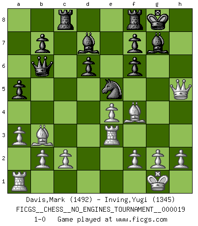Last move : 1-0 2009 August 10 6:30:2 [Event "FICGS__CHESS__NO_ENGINES_TOURNAMENT__000019"] [Site "FICGS"] [Date "2009.05.05"] [Round "1"] [White "Davis,Mark"] [Black "Inving,Yugi"] [Result "1-0"] [WhiteElo "1492"] [BlackElo "1345"] 1.e4 c5 2.Nf3 d6 3.Nc3 Nf6 4.d4 cxd4 5.Qxd4 Bd7 6.Bc4 Nc6 7.Qd1 g6 8.O-O Bg7 9.Bg5 Rc8 10.Re1 O-O 11.a3 h6 12.Bh4 Nh5 13.Nd5 g5 14.Nxg5 hxg5 15.Bxg5 Nf6 16.Nxf6+ exf6 17.Bf4 Ne5 18.Bb3 Qb6 19.Qh5 a5 20.Re3 1-0 Sicilian Kingside Castling by player White (move 8) Kingside Castling by player Black (move 10) Player White won this chess game. Follow this game move after move (download)It is not enough to be a good player... you must also play well. (Siegbert Tarrasch) Der Umstand, daß uns eine 7 Stunden Zeitkontrolle ermöglicht eine großartige, tiefe Partie zu spielen, ist für die Massenmedien nicht weiter von Bedeutung. (Alexej Shirov) La captura del Rey enemigo es la finalidad pero no el primer objetivo de la partida. (William Steinitz) Dans le domaine de la peinture, de la gravure et de la sculpture, dès la première décennie de notre siècle, les artistes abandonnent la représentation de la partie d'échecs pour se concentrer sur les pièces, sur les échiquiers et sur toutes les variations auxquelles les unes et les autres peuvent donner lieu. On passe en quelque sorte d'un thème social à un thème musical (au sens de la musica médiévale, c'est-à-dire d'une notion qui inclue le rythme, l'harmonie, la construction et la déconstruction, etc.). Graphiquement et picturalement, l'échiquier apparaît comme une structure ouverte, dynamique, d'une richesse infinie, autorisant toutes les combinatoires et débouchant sur des mouvements et des rythmes de nature exponentielle. (Michel Pastoureau) Those parts of the system that you can hit with a hammer (not advised) are called hardware; those program instructions that you can only curse at are called software. (Anonymous)