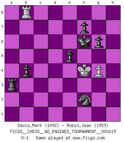 Last move : 0-1 2009 July 22 22:43:53 [Event "FICGS__CHESS__NO_ENGINES_TOURNAMENT__000019"] [Site "FICGS"] [Date "2009.05.05"] [Round "1"] [White "Davis,Mark"] [Black "Robin,Jean"] [Result "0-1"] [WhiteElo "1492"] [BlackElo "1959"] 1.e4 d6 2.d4 Nf6 3.Nc3 g6 4.Nf3 Bg7 5.Bd3 c6 6.Be3 b5 7.O-O O-O 8.Re1 b4 9.Ne2 Bg4 10.Ng3 Nbd7 11.h3 Bxf3 12.Qxf3 c5 13.e5 dxe5 14.dxe5 Nxe5 15.Qe2 Nxd3 16.cxd3 Qd6 17.Rad1 e6 18.b3 Rac8 19.d4 cxd4 20.Bxd4 Qe7 21.Qa6 Rc2 22.Bxa7 Ra8 23.Qd3 Rc3 24.Qd4 Rxa7 25.Qd8+ Qxd8 26.Rxd8+ Bf8 27.Rb8 Rxa2 28.Rd1 Kg7 29.Nf1 Rxb3 30.Ne3 R3b2 31.Rf1 Bc5 32.Nd1 Rd2 33.Rc8 Ne4 34.Kh2 Bxf2 35.Nxf2 Rxf2 36.Rxf2 Nxf2 37.Rb8 Nd3 38.Kg3 h5 39.Kf3 Kf6 40.Ke4 Ra3 41.g4 hxg4 42.hxg4 Nf2+ 43.Kf4 e5+ 0-1 Pirc : Classical (Two knights) system Kingside Castling by player White (move 7) Kingside Castling by player Black (move 7) 10 pieces endgame at move 42 : White KRP , Black KRNPPPP WHITE : King + 1 Rook 1 Pawn BLACK : King + 1 Rook 1 Knight 4 Pawns Player Black won this chess game. Follow this game move after move (download)Examine moves that smite! A good eye for smites is far more important than a knowledge of strategical principles. (Purdy) Warum muß ich gegen diesen IDIOTEN verlieren? (Aaron Nimzowitsch) Dejen al perfeccionista jugar por correo. (Yasser Seirawan) Les échecs, c'est l'imagination. (David Bronstein) Optimism is a variety of information deficit. Sometimes especially true for correspondence chess games. (Michael Aigner)