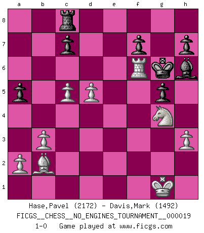 Last move : 1-0 2009 July 22 2:25:16 [Event "FICGS__CHESS__NO_ENGINES_TOURNAMENT__000019"] [Site "FICGS"] [Date "2009.05.05"] [Round "1"] [White "Hase,Pavel"] [Black "Davis,Mark"] [Result "1-0"] [WhiteElo "2172"] [BlackElo "1492"] 1.b3 e5 2.Bb2 Nc6 3.e3 Nf6 4.Bb5 a6 5.Bxc6 bxc6 6.Ne2 d6 7.O-O Bg4 8.d4 e4 9.c4 g6 10.Nd2 Bg7 11.f3 exf3 12.Nxf3 O-O 13.Ng3 Re8 14.Qd3 d5 15.Ne5 Qd6 16.c5 Qe6 17.Rae1 Rf8 18.Rf4 a5 19.h3 Bxh3 20.gxh3 Ne8 21.Ng4 Nf6 22.Nf2 Bh6 23.Rf3 Rfe8 24.e4 Nxe4 25.Ngxe4 dxe4 26.Rxe4 Qd5 27.Qe2 Rxe4 28.Qxe4 Qh5 29.Qxc6 Rc8 30.Ng4 Qg5 31.Qf6 Qxf6 32.Nxf6+ Kg7 33.d5 g5 34.Ng4 Kg6 35.Rf6+ 1-0 Nimzovich-Larsen attack : Modern variation Kingside Castling by player White (move 7) Kingside Castling by player Black (move 12) Player White won this chess game. Follow this game move after move (download)Of Chess it has been said that life is not long enough for it, but that is the fault of life, not Chess. (William Ewart Napier) Offener Brief an US-Präsident Bush anlässlich der Verhaftung Bobby Fishers: Verhaften Sie mich. Stecken Sie mich in dieselbe Zelle wie Bobby Fisher und geben Sie uns ein Schachspiel mit. (Boris Vassilievich Spassky) Yo adoro todas la posiciones. Denme una partida posicional difícil, y la jugaré. Pero posiciones totalmente ganadas, no las tolero. (Hein Donner) Vous savez, camarade Pachman, je n'éprouve pas de plaisir à être ministre, je jouerais plutôt aux échecs comme vous, ou alors ferais une révolution au Venezuela. (Che Guevara à Ludek Pachman, 'Checkmate in Prague', 1975) I teach you to lie, cheat and steal, and as soon as my back's turned you wait in line ? (Gregory House, House M.D.)