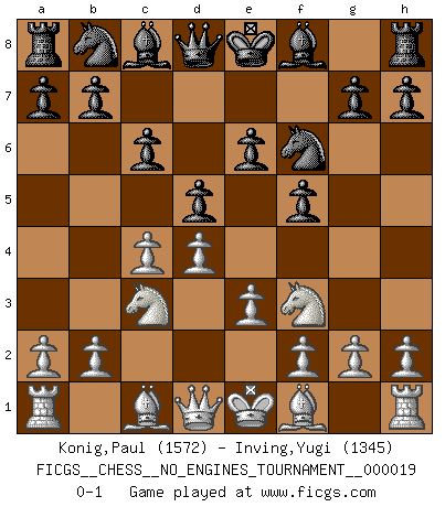 Last move : 0-1 2009 May 31 2:35:20 [Event "FICGS__CHESS__NO_ENGINES_TOURNAMENT__000019"] [Site "FICGS"] [Date "2009.05.05"] [Round "1"] [White "Konig,Paul"] [Black "Inving,Yugi"] [Result "0-1"] [WhiteElo "1572"] [BlackElo "1345"] 1.d4 e6 2.c4 f5 3.Nc3 Nf6 4.e3 d5 5.Nf3 c6 0-1 Queen's pawn Player Black won this chess game. Follow this game move after move (download)Chess teaches you to control the initial excitement you feel when you see something that looks good and it trains you to think objectively when you're in trouble. (Stanley Kubrick) Capablanka war das größte Genie der Schachgeschichte! Aber denken sie nicht er habe nichts vom Schach verstanden. Er wusste nur soviel wie er wissen musste um seine Ziele zu erreichen. (Mikhail Moiseyevich Botvinik) Peones: ellos son el alma de esta partida, solos forman el ataque y la defensa. (Philidor) Aidez vos pièces, elles vous aideront. (Paul Morphy) Whenever people agree with me, I always feel I must be wrong. (Oscar Wilde)
