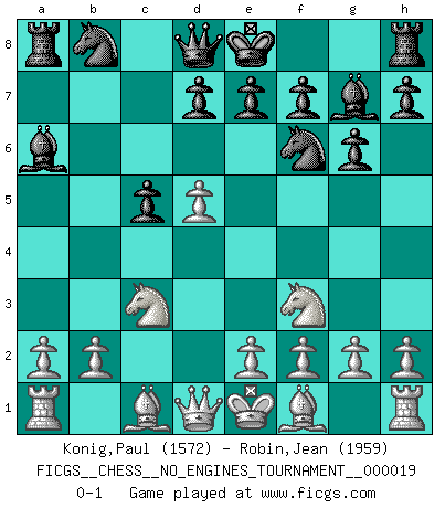 Last move : 0-1 2009 May 31 2:35:35 [Event "FICGS__CHESS__NO_ENGINES_TOURNAMENT__000019"] [Site "FICGS"] [Date "2009.05.05"] [Round "1"] [White "Konig,Paul"] [Black "Robin,Jean"] [Result "0-1"] [WhiteElo "1572"] [BlackElo "1959"] 1.d4 Nf6 2.Nf3 g6 3.c4 c5 4.d5 b5 5.cxb5 a6 6.bxa6 Bg7 7.Nc3 Bxa6 0-1 King's Indian : East Indian defense Player Black won this chess game. Follow this game move after move (download)The Pin is mightier than the sword. (Fred Reinfeld) Später, ... hatte ich zunehmend Erfolg in entscheidenden Partien. Vielleicht weil ich eine einfache Wahrheit erkannte: nicht nur ich hatte Angst, auch mein Gegner. (Mikhail Nekhemyevich Tal) Tu puedes aprender mucho mas de una partida que pierdas que de una partida ganada. Tendras que perder cientos de partidas antes de llegar a ser un buen jugador. (Jose Raul Capablanca) La vie et les Echecs sont tous les deux une lutte constante. (Lasker) That's absurd. I love it. (Gregory House, House M.D.)