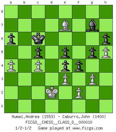 Last move : 1/2-1/2 2006 October 31 12:27:21 [Event "FICGS__CHESS__CLASS_D__000010"] [Site "FICGS"] [Date "2006.09.11"] [Round "1"] [White "Humel,Andrea"] [Black "Caburro,John"] [Result "1/2-1/2"] [WhiteElo "1553"] [BlackElo "1400"] 1.d4 f5 2.Nf3 Nf6 3.e3 g6 4.Bc4 d5 5.Bb3 Bg7 6.h4 Be6 7.Ng5 Bg8 8.Nd2 h6 9.Ngf3 Nbd7 10.c3 c6 11.Ne5 Nxe5 12.dxe5 Ne4 13.Nxe4 dxe4 14.Bxg8 Qxd1+ 15.Kxd1 O-O-O 16.Kc2 Rhxg8 17.b3 Bxe5 18.Ba3 e6 19.Bc5 b6 20.Bd4 Bd6 21.c4 c5 22.Bf6 Rdf8 23.Rad1 Kc7 24.Bb2 Rd8 25.Rd2 Be7 26.g3 Rxd2+ 27.Kxd2 Rd8+ 28.Ke2 Kc6 29.Be5 a6 30.h5 g5 31.Bg7 Bf8 32.Be5 b5 33.Bf6 Rd7 34.Rd1 Rxd1 35.Kxd1 bxc4 36.bxc4 Kb6 37.Bd8+ Kc6 38.a4 Bg7 39.Kc2 e5 40.Kd2 f4 41.Be7 1/2-1/2 Dutch Queenside Castling by player Black (move 15) This chess game ended in a draw. Follow this game move after move (download)War is the child of passion, passion is the child of narcissism and narcissism is the child. (...) Another game ? (Thibault de Vassal) Ich bin der einzige Schachspieler, der sich während der Vorbereitungen zum Turnier verletzt hat. (Woody Allen) Cuando veas una buena jugada, trata de encontrar otra mejor. (Emanuel Lasker) Les échecs sont utiles à l'exercice de la faculté de penser et à celle de l'imagination. Car nous devons posséder une méthode élaborée pour atteindre des buts partout où nous devons conduire notre raison. (Leibnitz) True nature is revealed in times of difficulty. (Chinese proverb)