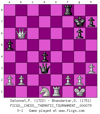 Last move : 0-1 2009 November 17 20:20:43 [Event "FICGS__CHESS__THEMATIC_TOURNAMENT__000079"] [Site "FICGS"] [Date "2009.05.08"] [Round "1"] [White "Satonnet,Patrick"] [Black "Bhandarkar,Dinesh"] [Result "0-1"] [WhiteElo "1722"] [BlackElo "1751"] 1.e4 e5 2.Nf3 Nc6 3.Bb5 Nd4 4.Nxd4 exd4 5.O-O c6 6.Bc4 d6 7.c3 dxc3 8.Nxc3 Nf6 9.Qb3 Be7 10.Bxf7+ Kf8 11.Be6 Bxe6 12.Qxe6 Qc8 13.Qb3 g6 14.d3 Kg7 15.Be3 Rf8 16.h3 Qd7 17.Rad1 d5 18.Bd4 b6 19.e5 Qe6 20.exf6+ Bxf6 21.Rde1 Qf5 22.Re7+ Kg8 23.Bxf6 Qxf6 24.Qa3 a5 25.Nd1 Rae8 26.Rfe1 Rxe7 27.Qxe7 Qd4 28.Qe6+ Kg7 29.Qxc6 Qxd3 30.Qxb6 d4 0-1 This chess game has been lost on time (started : 2009.05.08 20:35:3) Ruy Lopez : Bird's defense Kingside Castling by player White (move 5) Player Black won this chess game. Follow this game move after move (download)The game of chess is the touchstone of the intellect. (Goethe) Obwohl ich alt bin, darf mir niemand den Finger in den Mund stecken, sonst beisse ich. (Wilhelm Steinitz) El Ajedrez hace al hombre ser mas sabio y ver mas claro. (Vladimir Putin) Tous ces prétendus hommes politiques sont les pions, les Cavaliers, les Tours ou les Fous d'une partie d'échecs qui se jouera tant qu'un hasard ne renversera pas l'échiquier. (Honoré de Balzac) Never was anything great achieved without danger. (Niccolo Machiavelli)