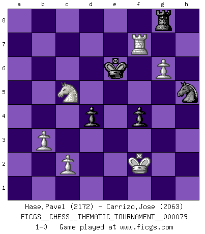 Last move : 1-0 2010 January 10 19:44:55 [Event "FICGS__CHESS__THEMATIC_TOURNAMENT__000079"] [Site "FICGS"] [Date "2009.05.08"] [Round "1"] [White "Hase,Pavel"] [Black "Carrizo,Jose"] [Result "1-0"] [WhiteElo "2172"] [BlackElo "2063"] 1.e4 e5 2.Nf3 Nc6 3.Bb5 Nd4 4.a4 Nxb5 5.axb5 Nf6 6.O-O Nxe4 7.Qe2 d5 8.d3 Nf6 9.Qxe5+ Be6 10.Qd4 Bd6 11.Rxa7 c5 12.bxc6 bxc6 13.b3 O-O 14.Ba3 Bxa3 15.Nxa3 Rxa7 16.Qxa7 Qd6 17.Nb1 Qb4 18.Nbd2 Qc3 19.Rc1 c5 20.Qa3 Nd7 21.Qa1 Qb4 22.d4 Rc8 23.Nf1 Bg4 24.Qa7 Nf6 25.Ne5 Qxd4 26.Qxf7+ Kh8 27.Nxg4 Qxg4 28.Re1 Rg8 29.Qc7 Qb4 30.Re3 Ne4 31.Qf4 Qb6 32.Qf5 Qf6 33.Qxf6 Nxf6 34.Re6 Rc8 35.g3 Kg8 36.Nd2 Kf7 37.Ra6 Re8 38.Kf1 h6 39.Rc6 Nd7 40.Nb1 Re5 41.Nc3 d4 42.Na4 Rh5 43.h4 Ke7 44.Rg6 Kf7 45.Ra6 Rf5 46.Ra5 Ke6 47.f4 g5 48.Ra6+ Ke7 49.Rxh6 gxf4 50.Rh7+ Kd6 51.g4 Rf8 52.g5 Ke6 53.Kf2 Rb8 54.h5 Rg8 55.g6 Nf6 56.Rf7 Nxh5 57.Nxc5+ 1-0 Ruy Lopez : Bird's defense Kingside Castling by player White (move 6) Kingside Castling by player Black (move 13) Player White won this chess game. Follow this game move after move (download)Chess is the gymnasium of the mind. (Blaise Pascal) Kann Schach nicht schließlich das Nationalspiel der Deutschen werden? Und welche weiteren Ausblicke bieten sich dann dar! Welche Hebung des allgemeinen Kultur-Niveaus, ja der Moral, wenn das Schachbrett den Kartentisch verdrängen würde! Wahrlich, ein Ziel, des Schweißes der Edlen wert! (Siegbert Tarrasch) Los Peones son nacidos libres, y aún así, se encuentran encadenados por todos lados. (Rick Kennedy) Il s'avisa de me proposer d'apprendre les échecs qu'il jouait un peu... me voilà forcené des échecs. J'achète un échiquier, je m'enferme dans ma chambre, j'y passe des jours et des nuits à vouloir apprendre par cur toutes les parties. (Jean-Jacques Rousseau, Confessions) The only difference between a tax man and a taxidermist is that the taxidermist leaves the skin. (Mark Twain)