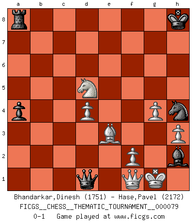 Last move : 0-1 2009 July 24 6:12:23 [Event "FICGS__CHESS__THEMATIC_TOURNAMENT__000079"] [Site "FICGS"] [Date "2009.05.08"] [Round "1"] [White "Bhandarkar,Dinesh"] [Black "Hase,Pavel"] [Result "0-1"] [WhiteElo "1751"] [BlackElo "2172"] 1.e4 e5 2.Nf3 Nc6 3.Bb5 Nd4 4.Nxd4 exd4 5.d3 Bc5 6.O-O c6 7.Bc4 d5 8.exd5 cxd5 9.Re1+ Ne7 10.Bb5+ Bd7 11.Bxd7+ Qxd7 12.Bf4 O-O 13.Nd2 b5 14.Nf3 f6 15.c3 dxc3 16.bxc3 a5 17.d4 Ba3 18.Rb1 Rfc8 19.Qe2 Rxc3 20.Rxb5 Rc4 21.Rb3 Bb4 22.Bd2 Bd6 23.Reb1 Nc6 24.Rb7 Qg4 25.h3 Qe4 26.Be3 Qe6 27.Nd2 Rb4 28.Qd3 Ne7 29.a3 Rxb7 30.Rxb7 a4 31.Qb5 Nf5 32.Nf1 Bxa3 33.g4 Nh4 34.Ng3 Bd6 35.Nh5 Qe4 36.Rxg7+ Kh8 37.Rxh7+ Qxh7 38.Nxf6 Qc2 39.Nxd5 Qd1+ 40.Qf1 Bh2+ 0-1 Ruy Lopez : Bird's defense Kingside Castling by player White (move 6) Kingside Castling by player Black (move 12) Player Black won this chess game. Follow this game move after move (download)It was clear to me that the vulnerable point of the American Grandmaster (Bobby Fischer) was in double-edged, hanging, irrational positions, where he often failed to find a win even in a won position. (Efim Geller) Es ist wirklich schade, dass so viele Schachspieler nicht auf ihr Äußeres achten! (Alexandra Kosteniuk) Si un gobernante no entiende al Ajedrez, ¿como puede governar él un reinado?. (El Rey Khusros II) Aux échecs, les retours au sommet sont rares : les dommages psychologiques consécutifs à une défaite sont trop sévères. (Daily Telegraph) If we knew what we were doing, we would not call it research. (Albert Einstein)