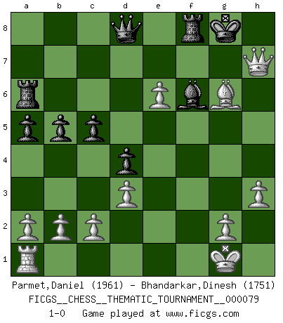 Last move : 1-0 2009 June 16 0:14:42 [Event "FICGS__CHESS__THEMATIC_TOURNAMENT__000079"] [Site "FICGS"] [Date "2009.05.08"] [Round "1"] [White "Parmet,Daniel"] [Black "Bhandarkar,Dinesh"] [Result "1-0"] [WhiteElo "1961"] [BlackElo "1751"] 1.e4 e5 2.Nf3 Nc6 3.Bb5 Nd4 4.Nxd4 exd4 5.O-O c6 6.Bc4 d6 7.d3 Nf6 8.Nd2 Be7 9.f4 O-O 10.Nf3 Bg4 11.h3 Bxf3 12.Qxf3 b5 13.Bb3 a5 14.e5 dxe5 15.fxe5 Nd7 16.Bxf7+ Kh8 17.Qh5 c5 18.Rf5 Ra6 19.e6 Nf6 20.Rxf6 Bxf6 21.Bg6 h6 22.Bxh6 gxh6 23.Qxh6+ Kg8 24.Qh7+ 1-0 Ruy Lopez : Bird's defense Kingside Castling by player White (move 5) Kingside Castling by player Black (move 9) Player White won this chess game. Follow this game move after move (download)During a Chess competition a Chessmaster should be a combination of a beast of prey and a monk. (Alexander Alekhine) Ich habe kein Problem mit Frauen, sondern nur mit dem Niveau ihres Schachspiels (Judith Polgar) Fischer deseaba darle a los Rusos una sopa de su propia medicina. (Larry Evans) Ce qui caractérise les parties de combat, c'est que si le défenseur a constamment de difficiles problèmes à résoudre, l'attaquant doit chercher sans relâche de nouvelles possibilités d'attaque. (Koblentz) I've lost money so fast in these clubs it's left me reeling. I've read every poker book ever written, but the only way to get better at the game is to go out and play with people who are really good. The problem is, you stand to lose a lot of money doing it. (Matt Damon)