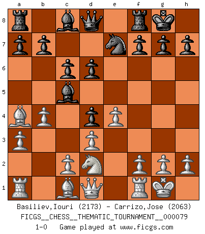 Last move : 1-0 2009 July 9 20:3:29 [Event "FICGS__CHESS__THEMATIC_TOURNAMENT__000079"] [Site "FICGS"] [Date "2009.05.08"] [Round "1"] [White "Basiliev,Iouri"] [Black "Carrizo,Jose"] [Result "1-0"] [WhiteElo "2173"] [BlackElo "2063"] 1.e4 e5 2.Nf3 Nc6 3.Bb5 Nd4 4.Nxd4 exd4 5.O-O Bc5 6.d3 c6 7.Ba4 d6 8.Nd2 Ne7 9.a3 O-O 10.b4 1-0 Ruy Lopez : Bird's defense Kingside Castling by player White (move 5) Kingside Castling by player Black (move 9) Player White won this chess game. Follow this game move after move (download)He who takes the Queen's Knight's Pawn will sleep in the streets. (Anonymous) Das ganze Leben mit einer Ehefrau ist wie ein Endspiel mit ungleichfarbigen Läufern. (Viktor Kortschnoi) La belleza de un movimiento no se refleja solo en su apariencia, sino en el pensamiento detrás de él. (Siegbert Tarrasch) Il (Jacob Murray) ne joue pas pour le bon coup, mais pour le meilleur. (Eloi Relange) I don't know, I don't care, and it doesn't make any difference. (Albert Einstein)