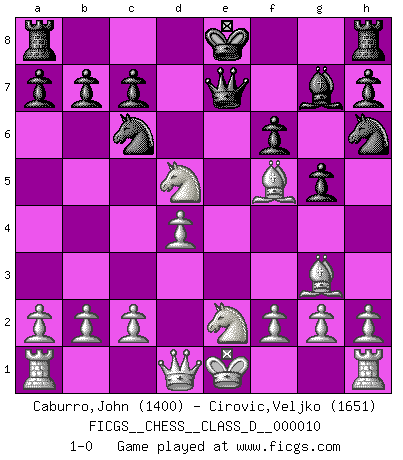Last move : 1-0 2006 October 16 10:36:21 [Event "FICGS__CHESS__CLASS_D__000010"] [Site "FICGS"] [Date "2006.09.11"] [Round "1"] [White "Caburro,John"] [Black "Cirovic,Veljko"] [Result "1-0"] [WhiteElo "1400"] [BlackElo "1651"] 1.Nc3 Nc6 2.d4 d5 3.Bg5 f6 4.Bh4 Bf5 5.e3 g5 6.Bg3 Bg7 7.Bd3 e5 8.Bxf5 exd4 9.exd4 Qe7+ 10.Nge2 Nh6 11.Nxd5 1-0 Dunst (Sleipner, Heinrichsen) Opening Player White won this chess game. Follow this game move after move (download)Only the player with the initiative has the right to attack. (Wilhelm Steinitz) Mit sehr nachdenklichem Gesicht schreitet Bobby durch den Turniersaal. Was ist passiert?, fragt Lombardy. Ich stehe schlecht, antwortet Fischer. Lombardy: Dann biete doch einfach Remis an. Fischer: So schlecht stehe ich nun auch wieder nicht! (Robert James Fischer) Con el tiempo, empecé a progresar en partidas decisivas. Tal vez porque me di cuenta de una simple verdad: no solo estaba yo nervioso sino también mi oponente. (Mikhail Tal) Les Echecs ont trois composantes : le temps, l'espace et le matériel en dernier. (Mikhail Tal) Have no fear of perfection - you'll never reach it. (Salvador Dali)