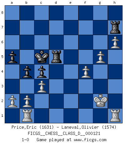 Last move : 1-0 2009 June 28 17:36:13 [Event "FICGS__CHESS__CLASS_D__000121"] [Site "FICGS"] [Date "2009.05.10"] [Round "1"] [White "Price,Eric"] [Black "Laneval,Olivier"] [Result "1-0"] [WhiteElo "1631"] [BlackElo "1574"] 1.e4 e6 2.d3 d5 3.Nd2 Nf6 4.Ngf3 c5 5.g3 Nc6 6.Bg2 Be7 7.O-O O-O 8.e5 Nd7 9.Re1 Qc7 10.Qe2 b6 11.Nf1 Bb7 12.Bf4 Rfd8 13.h4 Nf8 14.h5 a5 15.Ne3 Ba6 16.Ng4 c4 17.Rac1 Qa7 18.Qe3 Bc5 19.d4 Be7 20.c3 b5 21.Bh3 Rab8 22.Kg2 Rdc8 23.Rh1 b4 24.Bh6 f6 25.exf6 gxf6 26.Bxf8 Kxf8 27.Qh6+ Ke8 28.Qxh7 Kd8 29.Qg8+ Kc7 30.Qxe6 Rd8 31.Nxf6 Rd6 32.Nxd5+ Kb7 33.Qe4 Re8 34.Nxe7 Rxe7 35.Ne5 Kb6 36.Qe3 Kb5 37.Nxc6 Kxc6 38.d5+ Rxd5 39.Qxa7 Rxa7 40.Bg4 Rd2 41.Bf3+ Kb5 42.Rb1 Bb7 43.Bxb7 Rxb7 44.h6 Rh7 45.g4 Kc5 46.g5 Rd5 47.f4 1-0 French : King's Indian attack Kingside Castling by player White (move 7) Kingside Castling by player Black (move 7) Player White won this chess game. Follow this game move after move (download)Chess is a beautiful mistress. (Bent Larsen) Wenn Schach ein enormer Dschungel ist, der seine Myriaden von Geheimnissen nicht preisgeben will, dann sind Computer die Kettensägen einer gewaltigen ökologisch unsensiblen Nutzholzfirma. (Nigel Short) El Ajedrez era la lengua materna de Capablanca. (Reti) Fischer est le meilleur joueur du monde et Karpov n'est qu'un joueur de bistrot. (Garry Kasparov, agé de 16 ans) The Internet is so big, so powerful and pointless that for some people it is a complete substitute for life. (Andrew Brown)