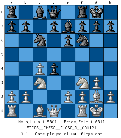Last move : 0-1 2009 June 20 1:35:12 [Event "FICGS__CHESS__CLASS_D__000121"] [Site "FICGS"] [Date "2009.05.10"] [Round "1"] [White "Neto,Luis"] [Black "Price,Eric"] [Result "0-1"] [WhiteElo "1580"] [BlackElo "1631"] 1.Nf3 Nf6 2.g3 e6 3.Bg2 c5 4.c4 Be7 5.Nc3 O-O 6.O-O Nc6 7.d4 cxd4 0-1 Reti Opening Kingside Castling by player Black (move 5) Kingside Castling by player White (move 6) Player Black won this chess game. Follow this game move after move (download)Chess is a part of culture and if a culture is declining then Chess too will decline. (Mikhail Botvinnik) Das Schachspiel hat wie die Liebe, die Musik, die Fähigkeit, den Menschen glücklich zu machen. Ich habe ein leises Gefühl des Bedauerns für jeden, der das Schachspiel nicht kennt, so wie ich jeden bedaure, der die Liebe nicht kennt. (Siegbert Tarrasch) ¿Quién es tu oponente esta tarde? Esta tarde mi oponente son las piezas negras. (Akiba Rubinstein) J'apprécie les joueurs d'est-indienne, c'est grâce à eux que je nourris ma famille depuis tant d'années. (Petrosian) There are more things in heaven and earth than practically anywhere else. (Unknown)