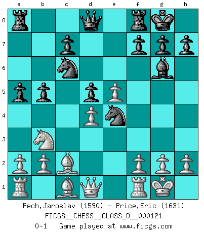 Last move : 0-1 2009 August 17 17:11:35 [Event "FICGS__CHESS__CLASS_D__000121"] [Site "FICGS"] [Date "2009.05.10"] [Round "1"] [White "Pech,Jaroslav"] [Black "Price,Eric"] [Result "0-1"] [WhiteElo "1590"] [BlackElo "1631"] 1.e4 e5 2.Nf3 Nc6 3.Bb5 a6 4.Ba4 Nf6 5.O-O Nxe4 6.d4 b5 7.Bb3 d5 8.dxe5 Be6 9.c3 Bc5 10.Nbd2 O-O 11.Bc2 Bf5 12.Nb3 Bg6 13.Nfd4 Bxd4 14.cxd4 a5 0-1 This chess game has been lost on time (started : 2009.05.10 17:11:3) Ruy Lopez : Open, 7.Bb3 Kingside Castling by player White (move 5) Kingside Castling by player Black (move 10) Player Black won this chess game. Follow this game move after move (download)Suddenly it was obvious to me in my analysis I had missed what Fischer had found with the greatest of ease at the board. (Mikhail Botvinnik) Die größte Kunst beim Schach besteht darin dem Gegner nicht zu zeigen was er tun kann. (Garry Kasparov) Si tu oponente no puede hacer nada activo, entonces no apures la posición; En vez de eso, dejalo estar sentado ahí, sufriendo y rogandote por un empate. (Jeremy Silman) La tactique est l'élément le plus important du milieu de jeu. (Siegbert Tarrasch) You have to believe in yourself. (Sun Tzu)