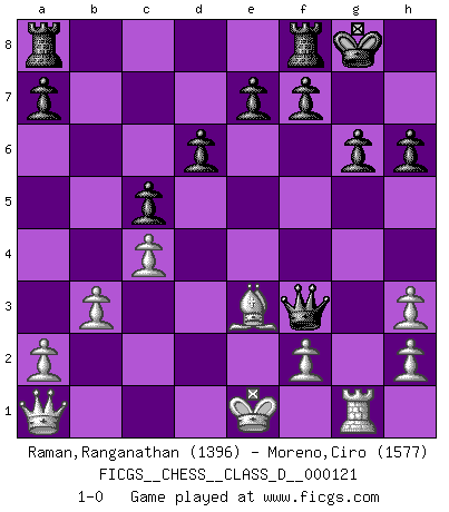 Last move : 1-0 2009 August 22 9:10:31 [Event "FICGS__CHESS__CLASS_D__000121"] [Site "FICGS"] [Date "2009.05.10"] [Round "1"] [White "Raman,Ranganathan"] [Black "Moreno,Ciro"] [Result "1-0"] [WhiteElo "1396"] [BlackElo "1577"] 1.e4 c5 2.Nc3 Nc6 3.Nf3 g6 4.Nd5 Bg7 5.Bc4 Nf6 6.Nxf6+ Bxf6 7.c3 d6 8.Qb3 O-O 9.d3 Na5 10.Qd1 Nxc4 11.dxc4 Bg7 12.Ng5 Qa5 13.Bd2 b5 14.cxb5 Qxb5 15.b3 h6 16.c4 Qb7 17.Nf3 Bxa1 18.Qxa1 Qxe4+ 19.Be3 Bh3 20.gxh3 Qxf3 21.Rg1 1-0 Sicilian : Closed, 2...Nc6 Kingside Castling by player Black (move 8) Player White won this chess game. Follow this game move after move (download)The enormous mental resilience, without which no Chess player can exist, was so much taken up by Chess that he could never free his mind of this game. (Albert Einstein) Bis zum Jahr 1971 verlief in meiner Schachkariere alles glatt. Dieses dramatische Match [Fischer-Taimanov 6:0] machte mein Leben zur Hölle. (Mark Taimanov) Fischer era un maestro de claridad y un Rey del posicionamiento astuto. Sus oponentes podían ver hacia donde se dirigía pero eran impotentes para detenerlo. (Bruce Pandolfini) Votre seul travail dans les ouvertures est d'obtenir un milieu de partie jouable. (Lajos Portish) Imagination is more important than knowledge. Knowledge is limited. Imagination encircles the world. (Albert Einstein)