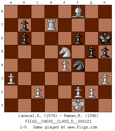 Last move : 1-0 2009 June 23 8:5:10 [Event "FICGS__CHESS__CLASS_D__000121"] [Site "FICGS"] [Date "2009.05.10"] [Round "1"] [White "Laneval,Olivier"] [Black "Raman,Ranganathan"] [Result "1-0"] [WhiteElo "1574"] [BlackElo "1396"] 1.e4 c5 2.Nf3 e6 3.d4 Qb6 4.Bc4 Nc6 5.d5 Na5 6.Bd3 c4 7.Be2 Bc5 8.O-O Nf6 9.Nc3 Qc7 10.Bg5 Ng4 11.h3 Ne5 12.a3 Ng6 13.b4 f6 14.Nb5 Qd8 15.Bc1 Bb6 16.bxa5 d6 17.axb6 axb6 18.Bxc4 e5 19.Bd2 h5 20.Bb4 O-O 21.Nxd6 Nf4 22.Nf5 Rf7 23.Ne7+ Kh7 24.d6 Rf8 25.Nxc8 Rxc8 26.d7 Rxc4 27.Bxf8 Rc7 28.Be7 Qxd7 29.Qxd7 Rxd7 30.Bb4 g5 31.Rfd1 Rxd1+ 32.Rxd1 Kg6 33.Rd6 Ne2+ 34.Kf1 Nf4 35.Nxe5+ Kg7 36.Rd7+ Kh6 37.Bf8+ 1-0 Sicilian defense Kingside Castling by player White (move 8) Kingside Castling by player Black (move 20) Player White won this chess game. Follow this game move after move (download)It's just you and your opponent at the board and you're trying to prove something. (Bobby Fischer) Darum geht es im Schach. Einen Tag gibst du deinem Gegner eine Lektion, am nächsten Tag gibt er dir eine. (Robert James Fischer) Con o sin el título, Bobby Fischer fue sin lugar a dudas el mas grande jugador de su época. (Burt Hochberg) Le moment que je préfère le plus dans une rencontre, c'est celui où je sens que la personnalité de l'adversaire se brise. (Robert Fischer) Knowledge will give you power, but character respect. (Bruce Lee)