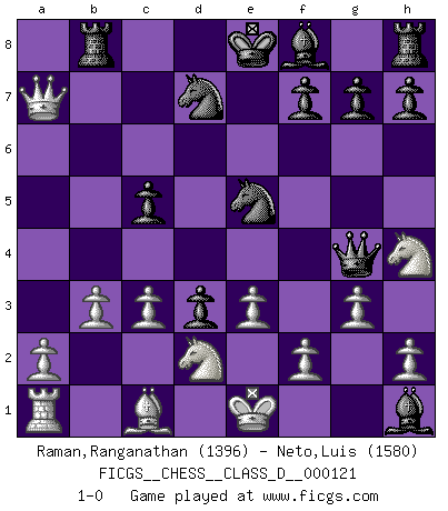 Last move : 1-0 2009 June 20 1:35:33 [Event "FICGS__CHESS__CLASS_D__000121"] [Site "FICGS"] [Date "2009.05.10"] [Round "1"] [White "Raman,Ranganathan"] [Black "Neto,Luis"] [Result "1-0"] [WhiteElo "1396"] [BlackElo "1580"] 1.g3 e5 2.Bg2 d5 3.e3 Nf6 4.c3 Bd6 5.Qb3 e4 6.Ne2 Nbd7 7.d4 exd3 8.Nd4 c5 9.Nf5 Bf8 10.Bxd5 Ne5 11.Bxb7 Rb8 12.Qb5+ Nfd7 13.Nd2 Bxb7 14.b3 Bxh1 15.Qa6 Qg5 16.Qxa7 Qg4 17.Nh4 1-0 Benko's Opening Player White won this chess game. Follow this game move after move (download)Any material change in a position must come about by mate, a capture, or a Pawn promotion. (Purdy) Die meiste Zeit treffe ich auf Gegner, die meine Enkel sein könnten. Ich bin da, um ihnen zu zeigen, dass sie von mir noch einiges lernen können. (Viktor Kortschnoi) Algunos sacrificios son sólidos, los demás son míos. (Mikhail Tal) Les échecs c'est le défi de l'alpiniste, toujours plus haut, prêt à tout pour monter à l'assaut du Roi ennemi. Les échecs, c'est de la musique en mouvement, un ballet majestueux pour les yeux. C'est de la poésie composée par les fantômes du passé qui au même titre que Rimbaud ou Verlaine méritent notre admiration. Les échecs, c'est de la peinture ou le moindre mouvement modifie le tableau pour en faire un Picasso ou un Van Gogh. Les échecs, c'est tout et rien, c'est la vie et la mort. Jjulie33 sur le forum de France-Echecs. Computer Science is no more about computers than astronomy is about telescopes. (Edsger W. Dijkstra)