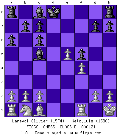 Last move : 1-0 2009 June 20 1:35:43 [Event "FICGS__CHESS__CLASS_D__000121"] [Site "FICGS"] [Date "2009.05.10"] [Round "1"] [White "Laneval,Olivier"] [Black "Neto,Luis"] [Result "1-0"] [WhiteElo "1574"] [BlackElo "1580"] 1.e4 Nc6 2.Nf3 e5 3.Bb5 Nge7 4.d4 Nxd4 5.Nxd4 a6 6.Ba4 exd4 7.Qxd4 Nc6 8.Bxc6 dxc6 9.Qxd8+ Kxd8 10.O-O Bd6 11.f4 f5 12.e5 Bc5+ 13.Kh1 1-0 KP : Nimzovich defense Kingside Castling by player White (move 10) Player White won this chess game. Follow this game move after move (download)We don't really know how the game was invented, though there are suspicions. As soon as we discover the culprits, we'll let you know. (Bruce Pandolfini) Bobby Fischer ist kein Vorbild für die heutige Jugend. (Viktor Kortschnoi) Ciertamente el estado mental actual de Bobby Fischer es una tragedia. Uno de los mas grandes jugadores de Ajedrez del mundo -el orgullo y pena del Ajedrez Americano. (Frank Brady) Botvinnik disait en comparant les échecs à la musique: Il existe une science dont le but est l'étude de l'acoustique et des sons. Mais il y a aussi un art qui se sert de l'océan des sons : c'est la musique. De toute évidence, il en est de même pour la pensée. La logique est l'étude des lois de la réflexion et les échecs reflètent, en tant qu'art, le côté logique de la réflexion, sous la forme d'images artistiques... Extrait de Fischer - Spassky, Reykjavik 1972 par Alexander & F. Wyndham (Ed. Solar), p 37. Beta. Software undergoes beta testing shortly before it's released. Beta is latin for still doesn't work. (Anonymous)