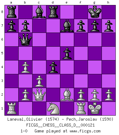 Last move : 1-0 2009 September 3 22:6:16 [Event "FICGS__CHESS__CLASS_D__000121"] [Site "FICGS"] [Date "2009.05.10"] [Round "1"] [White "Laneval,Olivier"] [Black "Pech,Jaroslav"] [Result "1-0"] [WhiteElo "1574"] [BlackElo "1590"] 1.e4 e6 2.d4 d5 3.Nc3 Nf6 4.e5 Nfd7 5.Nf3 c5 6.Be3 Nc6 7.Be2 Be7 8.O-O O-O 9.a3 cxd4 10.Nxd4 Ndxe5 11.Qd2 Nxd4 12.Bxd4 Nc6 13.Nd1 e5 14.Bc3 d4 15.Bb4 Nxb4 16.axb4 Qb6 17.c3 Rd8 18.Qc2 1-0 This chess game has been lost on time (started : 2009.05.10 17:11:3) French : Steinitz variation Kingside Castling by player White (move 8) Kingside Castling by player Black (move 8) Player White won this chess game. Follow this game move after move (download)Pawns are born free, yet they are everywhere in chains. (Rick Kennedy) Gott hat gewollt, dass ich Champion werde. (Surab Azmajparaschvili) Aquellos que dicen entender al Ajedrez, no entienden nada. (Robert Hubner) A chaque perte on perd un peu de soi. (Joël Lautier) The question of whether computers can think is just like question of whether submarines can swim. (Edsger W. Dijkstra)