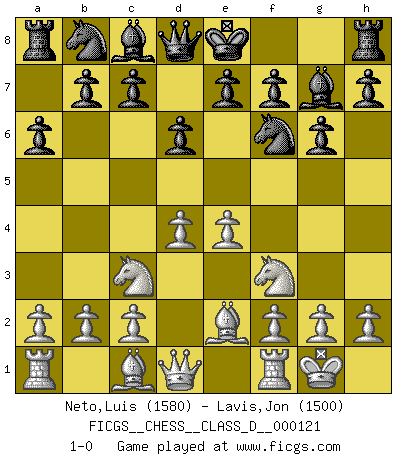 Last move : 1-0 2009 July 7 22:4:33 [Event "FICGS__CHESS__CLASS_D__000121"] [Site "FICGS"] [Date "2009.05.10"] [Round "1"] [White "Neto,Luis"] [Black "Lavis,Jon"] [Result "1-0"] [WhiteElo "1580"] [BlackElo "1500"] 1.Nf3 g6 2.e4 Bg7 3.d4 d6 4.Be2 a6 5.O-O Nf6 6.Nc3 1-0 This chess game has been lost on time (started : 2009.05.10 17:11:3) Reti Opening Kingside Castling by player White (move 5) Player White won this chess game. Follow this game move after move (download)When asked, -How is that you pick better moves than your opponents?, I responded: I'm very glad you asked me that, because, as it happens, there is a very simple answer. I think up my own moves, and I make my opponent think up his. (Alexander Alekhine) Wenn Dein Gegner dir ein Remis anbietet, versuch herauszufinden, weshalb er glaubt schlechter zu stehen. (Nigel Short) El sobresalir en el Ajedrez es un signo de una mente intrigante. (Sir Arthur Conan Doyle) En blitz, le Cavalier l'emporte sur le Fou. (Vlastimil Hort) Follow your passion, and success will follow you. (Arthur Buddhold)
