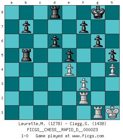 Last move : 1-0 2009 July 13 10:25:8 [Event "FICGS__CHESS__RAPID_D__000023"] [Site "FICGS"] [Date "2009.05.10"] [Round "1"] [White "Leurette,Marc-Antoine"] [Black "Clegg,Stuart"] [Result "1-0"] [WhiteElo "1278"] [BlackElo "1438"] 1.e4 Nf6 2.Nc3 e5 3.Nf3 Nc6 4.Bc4 Bb4 5.a3 Bxc3 6.dxc3 O-O 7.Bg5 d6 8.b4 Bg4 9.Be2 Bxf3 10.Bxf3 h6 11.Bxf6 Qxf6 12.O-O a6 13.c4 Nd4 14.c3 Nxf3+ 15.Qxf3 Qxf3 16.gxf3 Rae8 17.Kh1 Re6 18.a4 Rf6 19.Rg1 Rxf3 20.Rg2 Rxc3 21.c5 Rb3 22.cxd6 cxd6 23.b5 Rb4 24.f3 axb5 25.axb5 Rxb5 26.Rd1 Rd8 27.Rdg1 g6 28.h4 h5 29.Rf2 1-0 This chess game has been lost on time (started : 2009.05.10 20:7:31) Alekhine's defense Kingside Castling by player Black (move 6) Kingside Castling by player White (move 12) Player White won this chess game. Follow this game move after move (download)The isolated Pawn casts gloom over the entire chessboard. (Aaron Nimzovich) Der Verteidiger gebe der Gewalt nach, aber nur der Gewalt. Er schaffe sich nicht freiwillig, etwa aus Blindheit oder aus Schrecken, irgendwelche Schwächen. Er lasse sich nicht bluffen. (Emanuel Lasker) Hasta este punto, las blancas han seguido un análisis bien conocido. Pero ahora el hace un error fatal: empieza a usar su propia cabeza. (Siegbert Tarrasch) Il n'y a pas eu de défaite parce que je ne crois pas que cet ordinateur ait jamais existé. IBM a triché en refusant d'imprimer les modes de recherche de la machine. C'est évident, pendant le match, des coups décisifs ont été joués par des êtres humains. Aujourd'hui, les meilleurs spécialistes en informatique ne peuvent toujours pas expliquer comment Deep-Blue a pu jouer contre la logique des ordinateurs. IBM a gagné une guerre de communication, mais ils sont incapables de prouver que l'ordinateur a gagné tout seul. (Garry Kasparov) Life is like internet, nothing interesting, but noone want to leave it. (Ilmars Cirulis)