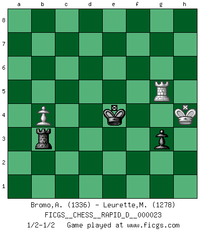 Last move : 1/2-1/2 2009 June 2 9:31:7 [Event "FICGS__CHESS__RAPID_D__000023"] [Site "FICGS"] [Date "2009.05.10"] [Round "1"] [White "Bromo,Alexis"] [Black "Leurette,Marc-Antoine"] [Result "1/2-1/2"] [WhiteElo "1336"] [BlackElo "1278"] 1.e4 e5 2.Nf3 Nc6 3.Bb5 Nf6 4.O-O Nxe4 5.Re1 Nd6 6.Bxc6 dxc6 7.Nxe5 Be7 8.d4 O-O 9.Nc3 b6 10.Nxc6 Qd7 11.Nxe7+ Kh8 12.Nxc8 Raxc8 13.Nd5 c6 14.Ne7 Rce8 15.Nxc6 Qxc6 16.d5 Rxe1+ 17.Qxe1 Qxd5 18.Bf4 Re8 19.Qd2 Qxd2 20.Bxd2 Nc4 21.Bc3 Re2 22.Rc1 Kg8 23.Kf1 Re8 24.Re1 Rd8 25.Ke2 a5 26.Kf3 b5 27.b3 Na3 28.Bxa5 Nxc2 29.Rc1 Rc8 30.Rd1 f6 31.g3 g5 32.Rd5 Kf7 33.Kg4 b4 34.h4 h6 35.Kf5 Nd4+ 36.Rxd4 Rc5+ 37.Kg4 Rxa5 38.Rxb4 Rxa2 39.f3 Rf2 40.hxg5 hxg5 41.f4 Kg6 42.fxg5 f5+ 43.Kh3 Kxg5 44.Rb5 Rf3 45.b4 Rb3 46.Rb8 f4 47.Rb5+ Kf6 48.Rb6+ Kf5 49.Rb5+ Ke4 50.Kh4 fxg3 51.Rg5 1/2-1/2 Ruy Lopez : Berlin defense, Open variation Kingside Castling by player White (move 4) Kingside Castling by player Black (move 8) 10 pieces endgame at move 40 : White KRPPPP , Black KRPP WHITE : King + 1 Rook 4 Pawns BLACK : King + 1 Rook 2 Pawns 9 pieces endgame at move 40 : White KRPPP , Black KRPP WHITE : King + 1 Rook 3 Pawns BLACK : King + 1 Rook 2 Pawns 8 pieces endgame at move 42 : White KRPPP , Black KRP WHITE : King + 1 Rook 3 Pawns BLACK : King + 1 Rook 1 Pawn 7 pieces endgame at move 43 : White KRPP , Black KRP WHITE : King + 1 Rook 2 Pawns BLACK : King + 1 Rook 1 Pawn 6 pieces endgame at move 50 : White KRP , Black KRP WHITE : King + 1 Rook 1 Pawn BLACK : King + 1 Rook 1 Pawn This chess game ended in a draw. Follow this game move after move (download)The passed pawn is a criminal, who should be kept under lock and key. Mild measures, such as police surveillance, are not sufficient. (Nimzovitch) Ich hatte meine größten Erfolge, als ich 47 Jahre alt war. Kasparow war noch nicht mal 42 und hat das Schach schon im Stich gelassen. (Viktor Kortschnoi) Bobby es la celebridad menos entendida y malinterpretada que camina el la faz de esta tierra. (Yasser Seirawan) Si je n'étais pas joueur d'échecs, je serais le meilleur dans quelque chose d'autre. (Anatoli Karpov) I find your interest interesting. (Gregory House, House M.D.)