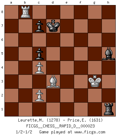 Last move : 1/2-1/2 2009 June 18 9:17:34 [Event "FICGS__CHESS__RAPID_D__000023"] [Site "FICGS"] [Date "2009.05.10"] [Round "1"] [White "Leurette,Marc-Antoine"] [Black "Price,Eric"] [Result "1/2-1/2"] [WhiteElo "1278"] [BlackElo "1631"] 1.e4 e5 2.Nf3 Nc6 3.d4 exd4 4.Nxd4 Nf6 5.Nc3 Bb4 6.Nxc6 Bxc3+ 7.bxc3 bxc6 8.Bd3 d6 9.O-O O-O 10.Ba3 Re8 11.c4 c5 12.Bb2 Bb7 13.Qf3 Re6 14.Rae1 Qe7 15.Bxf6 Rxf6 16.Qg4 Rg6 17.Qf3 Re8 18.Qf4 Qe5 19.Qxe5 Rxe5 20.f3 h5 21.Rb1 Bc6 22.Rb8+ Re8 23.Rxe8+ Bxe8 24.Rb1 Re6 25.Rb7 Re7 26.Rxa7 Kf8 27.a4 Bd7 28.a5 Ba4 29.Ra8+ Re8 30.Ra7 Rc8 31.Kf2 Ke7 32.a6 Bc6 33.Ke3 Kd8 34.Kf4 Rb8 35.e5 Kd7 36.exd6 Kxd6 37.Kg5 g6 38.h4 Bd7 39.Kf6 Be6 40.Rb7 Ra8 41.a7 Kd7 42.g4 hxg4 43.fxg4 Bxg4 44.Kxf7 Bf3 45.Rb8 Rxa7 46.Kxg6 Ra6+ 47.Kg5 Ra1 48.h5 Rg1+ 49.Kh4 Rh1+ 50.Kg3 Bxh5 1/2-1/2 Scotch : Schmidt variation Kingside Castling by player White (move 9) Kingside Castling by player Black (move 9) 10 pieces endgame at move 50 : White KRBPP , Black KRBPP WHITE : King + 1 Rook 1 Bishop 2 Pawns BLACK : King + 1 Rook 1 Bishop 2 Pawns This chess game ended in a draw. Follow this game move after move (download)A Chess game is divided into three stages: the first, when you hope you have the advantage, the second when you believe you have an advantage, and the third... when you know you're going to lose ! (Savielly Tartakower) In der Schule lernt man nichts. Es ist nur Zeitverschwendung. (Robert James Fischer) Combinaciones deslumbrantes son para la mayoría, mover madera es para los pocos. (Georg Kieninger) Les échecs sont utiles à l'exercice de la faculté de penser et à celle de l'imagination. Car nous devons posséder une méthode élaborée pour atteindre des buts partout où nous devons conduire notre raison. (Leibnitz) Always be a first-rate version of yourself, instead of a second-rate version of somebody else. (Judy Garland)