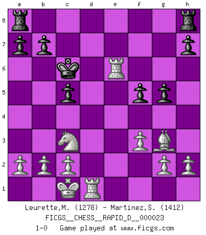 Last move : 1-0 2009 June 17 4:16:27 [Event "FICGS__CHESS__RAPID_D__000023"] [Site "FICGS"] [Date "2009.05.10"] [Round "1"] [White "Leurette,Marc-Antoine"] [Black "Martinez,Silvio"] [Result "1-0"] [WhiteElo "1278"] [BlackElo "1412"] 1.e4 e5 2.Nf3 Nc6 3.d4 exd4 4.Nxd4 Nxd4 5.Qxd4 d6 6.Bd3 c5 7.Qc4 Be6 8.Qb5+ Qd7 9.Nc3 Qxb5 10.Bxb5+ Bd7 11.Bxd7+ Kxd7 12.Bf4 Nf6 13.O-O-O Ng4 14.Bg3 Be7 15.e5 Kc7 16.exd6+ Bxd6 17.Bxd6+ Kc6 18.Bg3 g5 19.f3 Ne3 20.Rd6+ Kc7 21.Re6 Kd7 22.Rxe3 f5 23.Rd1+ Kc6 24.Re6+ 1-0 Scotch : Ghulam Kassim variation Queenside Castling by player White (move 13) Player White won this chess game. Follow this game move after move (download)Adequate compensation for a sacrifice is having a sound combination leading to a winning position; adequate compensation for a blunder is having your opponent snatch defeat from the jaws of victory. (Bruce A. Moon) Die Arbeit ist etwas Unnatürliches. Die Faulheit allein ist göttlich. (Anatole France) No hay precio que no valga la pena por la cabellera del Rey enemigo. (Koblentz) La tactique est l'élément le plus important du milieu de jeu. (Siegbert Tarrasch) Kids, you tried your best and you failed miserably. The lesson is, never try. (Simpsons)