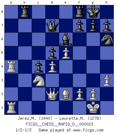 Last move : 1/2-1/2 2009 June 21 10:3:0 [Event "FICGS__CHESS__RAPID_D__000023"] [Site "FICGS"] [Date "2009.05.10"] [Round "1"] [White "Jerez,Miriam"] [Black "Leurette,Marc-Antoine"] [Result "1/2-1/2"] [WhiteElo "1440"] [BlackElo "1278"] 1.e4 e5 2.Nf3 Nc6 3.c4 Nf6 4.Nc3 Bc5 5.d3 d6 6.Be2 O-O 7.O-O Be6 8.a3 a6 9.b4 Bd4 10.Bb2 b5 11.cxb5 axb5 12.Qd2 Rb8 13.a4 bxa4 14.Rxa4 Nxb4 15.Nb1 Nc6 16.Nxd4 Nxd4 17.Bxd4 exd4 18.Rxd4 c5 19.Ra4 Qd7 20.Nc3 d5 21.e5 Ng4 22.d4 c4 23.h3 Nh6 24.Rfa1 1/2-1/2 Dresden Opening Kingside Castling by player Black (move 6) Kingside Castling by player White (move 7) This chess game ended in a draw. Follow this game move after move (download)There is only one thing Fischer does in Chess without pleasure: to lose ! (Boris Spassky) Fallen sollten polizeilich verboten werden. (Savielly Grigorievitsch Tartakower) Las Aperturas te enseñan aperturas. ¡Los Finales te enseñan Ajedrez!. (Stephan Gerzadowicz) Le thème de l'attaque double intervient d'une manière ou d'une autre dans l'immense majorité des combinaisons. (Youri Averbakh) The hypothalamus is one of the most important parts of the brain, involved in many kinds of motivation, among other functions. The hypothalamus controls the 'Four Fs: Fighting, Fleeing, Feeding and Mating. (Unknown author)