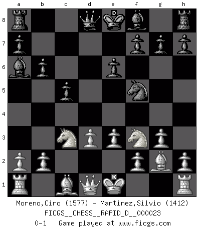 Last move : 0-1 2009 July 11 10:17:5 [Event "FICGS__CHESS__RAPID_D__000023"] [Site "FICGS"] [Date "2009.05.10"] [Round "1"] [White "Moreno,Ciro"] [Black "Martinez,Silvio"] [Result "0-1"] [WhiteElo "1577"] [BlackElo "1412"] 1.c4 c5 2.Nc3 Nf6 3.g3 Nc6 4.Bg2 b6 5.d3 d5 6.cxd5 Nd4 7.e3 Nf5 8.Nf3 Nxd5 9.Nxd5 e6 10.Nc3 Ba6 0-1 This chess game has been lost on time (started : 2009.05.10 20:7:31) English : Symmetrical variation Player Black won this chess game. Follow this game move after move (download)I give 98 percent of my mental energy to Chess. Others give only 2 percent. (Bobby Fischer) Dein Körper muss in Topform sein. Dein Schach verfällt, wenn dein Körper verfällt. Der Körper kann nicht vom Geist getrennt werden. (Robert James Fischer) Tu no necesitas jugar muy bien, únicamente ayudar a tu oponenet a que juegue muy mal. (Genrikh Chepukaitis) Les Echecs mettent en conflit, non pas deux intelligences, mais deux volontés. (Lasker) The existence of forgetting has never been proved: We only know that some things don't come to mind when we want them. (Friedrich Nietzsche)