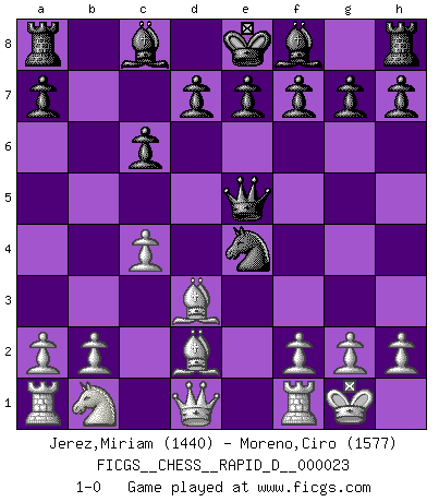 Last move : 1-0 2009 July 8 22:7:11 [Event "FICGS__CHESS__RAPID_D__000023"] [Site "FICGS"] [Date "2009.05.10"] [Round "1"] [White "Jerez,Miriam"] [Black "Moreno,Ciro"] [Result "1-0"] [WhiteElo "1440"] [BlackElo "1577"] 1.e4 c5 2.c4 Nc6 3.Nf3 Nf6 4.d4 cxd4 5.Nxd4 Nxe4 6.Nxc6 bxc6 7.Bd3 Qa5+ 8.Bd2 Qe5 9.O-O 1-0 This chess game has been lost on time (started : 2009.05.10 20:7:31) Sicilian defense Kingside Castling by player White (move 9) Player White won this chess game. Follow this game move after move (download)No other master has such a terrific will to win. At the board he radiates danger, and even the strongest opponents tend to freeze, like rabbits when they smell a panther. Even his weaknesses are dangerous. As white, his opening game is predictable - you can make plans against it - but so strong that your plans almost never work. In the middle game his precision and invention are fabulous, and in the end game you simply cannot beat him. (Anonymous German Expert) Wer der Ansicht ist, daß alle Schachspieler verrückt sind, wird durch Studium des Lebens von Emil Josef Diemer nicht auf andere Gedanken kommen. (Hans Ree) En la vida, como en el Ajedrez, los Peones propios obstruyen nuestro camino. La gran fortuna de un hombre, su comodidad, placer, hijos, libros, que deberían ayudarle a ganar, con mucha frecuencia lo ponen en Jaque Mate. (Charles Buxton) Les échecs sont un jeu terrible. Si vous n'avez pas le centre, votre adversaire a une position plus libre. Par contre, si vous avez le centre, alors vous avez vraiment quelque chose pour laquelle vous inquiéter ! (Siegbert Tarrasch) God is an atheist. (Unknown)