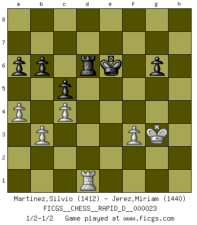 Last move : 1/2-1/2 2009 July 1 3:1:49 [Event "FICGS__CHESS__RAPID_D__000023"] [Site "FICGS"] [Date "2009.05.10"] [Round "1"] [White "Martinez,Silvio"] [Black "Jerez,Miriam"] [Result "1/2-1/2"] [WhiteElo "1412"] [BlackElo "1440"] 1.e4 e5 2.d4 Nf6 3.d5 Nxe4 4.Qe2 f5 5.Nf3 d6 6.Nbd2 Nxd2 7.Bxd2 e4 8.Bg5 Be7 9.Bxe7 Qxe7 10.Nd4 g6 11.Qe3 b6 12.Bb5+ Bd7 13.c4 a6 14.Bxd7+ Nxd7 15.O-O c5 16.Nc6 Qf6 17.b3 h5 18.f3 f4 19.Qxe4+ Ne5 20.Rfe1 O-O 21.Nxe5 dxe5 22.Qxe5 Qxe5 23.Rxe5 Rfe8 24.Rxe8+ Rxe8 25.d6 Rd8 26.Rd1 Kf7 27.Kf2 Ke6 28.a4 h4 29.g3 fxg3+ 30.hxg3 hxg3+ 31.Kxg3 Rxd6 1/2-1/2 King's pawn game Kingside Castling by player White (move 15) Kingside Castling by player Black (move 20) This chess game ended in a draw. Follow this game move after move (download)In complicated positions, Bobby Fischer hardly had to be afraid of anybody. (Paul Keres) Wer nie einen Fehler gemacht hat, hat nie etwas Neues ausprobiert. (Albert Einstein) El Ajedrez es un juego de pelea el cual es puramente intelectual e incluye la suerte. (Richard Reti) C'est une question de caractère, Beaucoup de gens perdent leur motivation très vite. D'autres, ils sont rares, peuvent la conserver très longtemps. J'aime les échecs, encore aujourd'hui je suis heureux d'analyser des parties. J'aime toujours gagner, je déteste encore perdre. Bien jouer est important pour mon intégrité intellectuelle et morale. Et puis les échecs vivent en ce moment une période historique grâce à Internet. Ils se développent dans les systèmes éducatifs à travers le monde. Ils sortent de leur ghetto, et c'est mon rôle de mener à bien cette révolution. (Gary Kasparov) The greatest con, that he ever pulled... was making you believe... that he is you. (Revolver, movie)