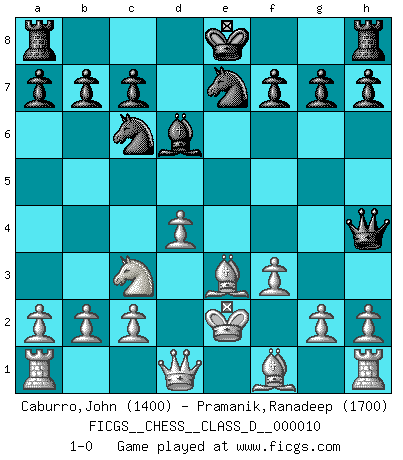 Last move : 1-0 2006 November 7 9:30:35 [Event "FICGS__CHESS__CLASS_D__000010"] [Site "FICGS"] [Date "2006.09.11"] [Round "1"] [White "Caburro,John"] [Black "Pramanik,Ranadeep"] [Result "1-0"] [WhiteElo "1400"] [BlackElo "1700"] 1.f4 e5 2.fxe5 d6 3.exd6 Bxd6 4.Nf3 Bg4 5.d4 Bxf3 6.exf3 Qh4+ 7.Ke2 Nc6 8.Be3 Nge7 9.Nc3 1-0 This chess game has been lost on time (started : 2006.09.11 9:57:48) Bird : From gambit Player White won this chess game. Follow this game move after move (download)Chess is like life. (Boris Spassky) Ja, ich habe einmal eine Blitzpartie gespielt, es war in einem Zug, 1929. --im Interview 1989 (Mikhail Moiseyevich Botvinik) Yo no creo en la psicología. Yo creo en las buenas movidas. (Bobby Fischer) Les échecs, c'est l'imagination. (David Bronstein) The existence of forgetting has never been proved: We only know that some things don't come to mind when we want them. (Friedrich Nietzsche)
